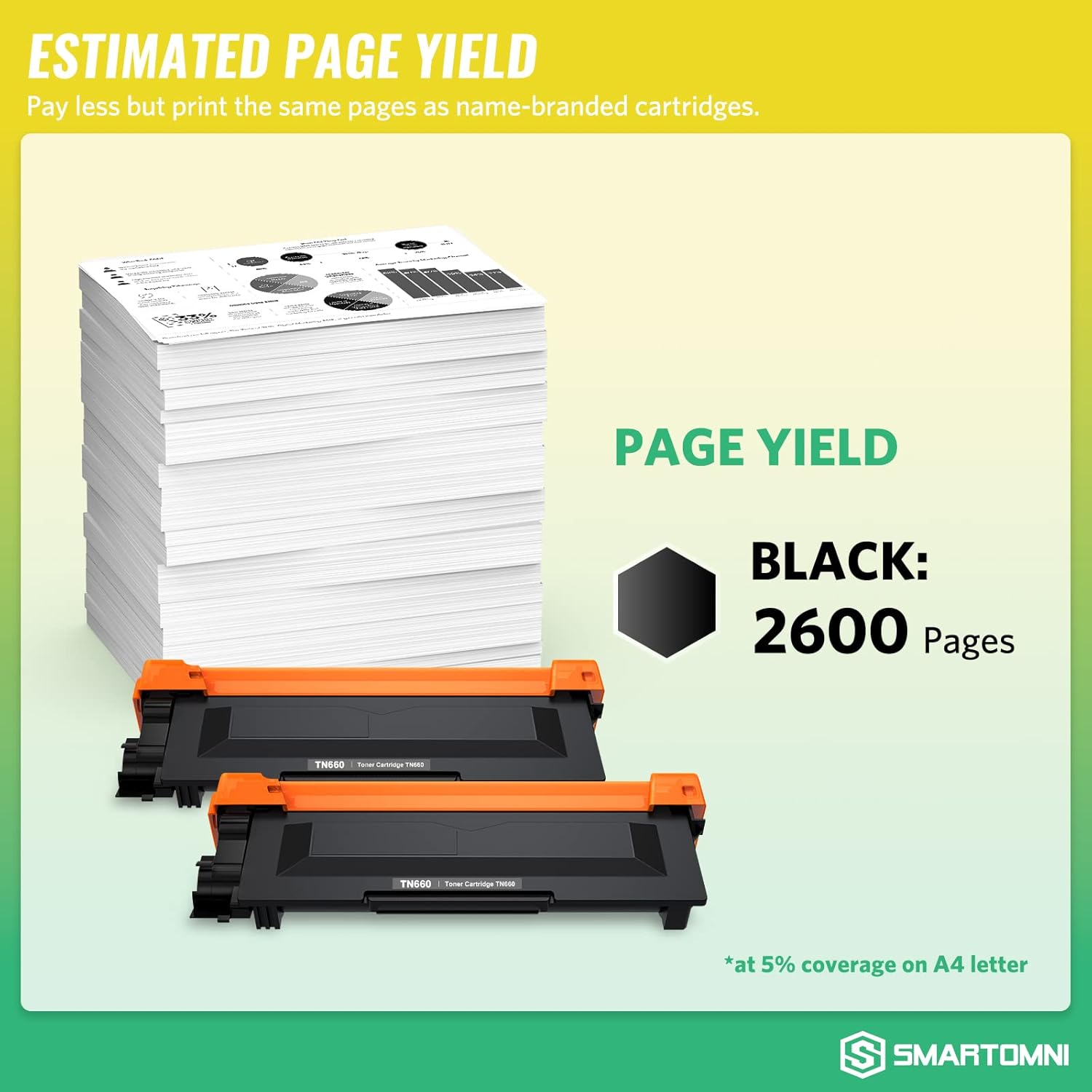 - Estimated Page Yield: Per TN660 toner can print 2600 pages at 5% coverage of letter/A4 as usual.