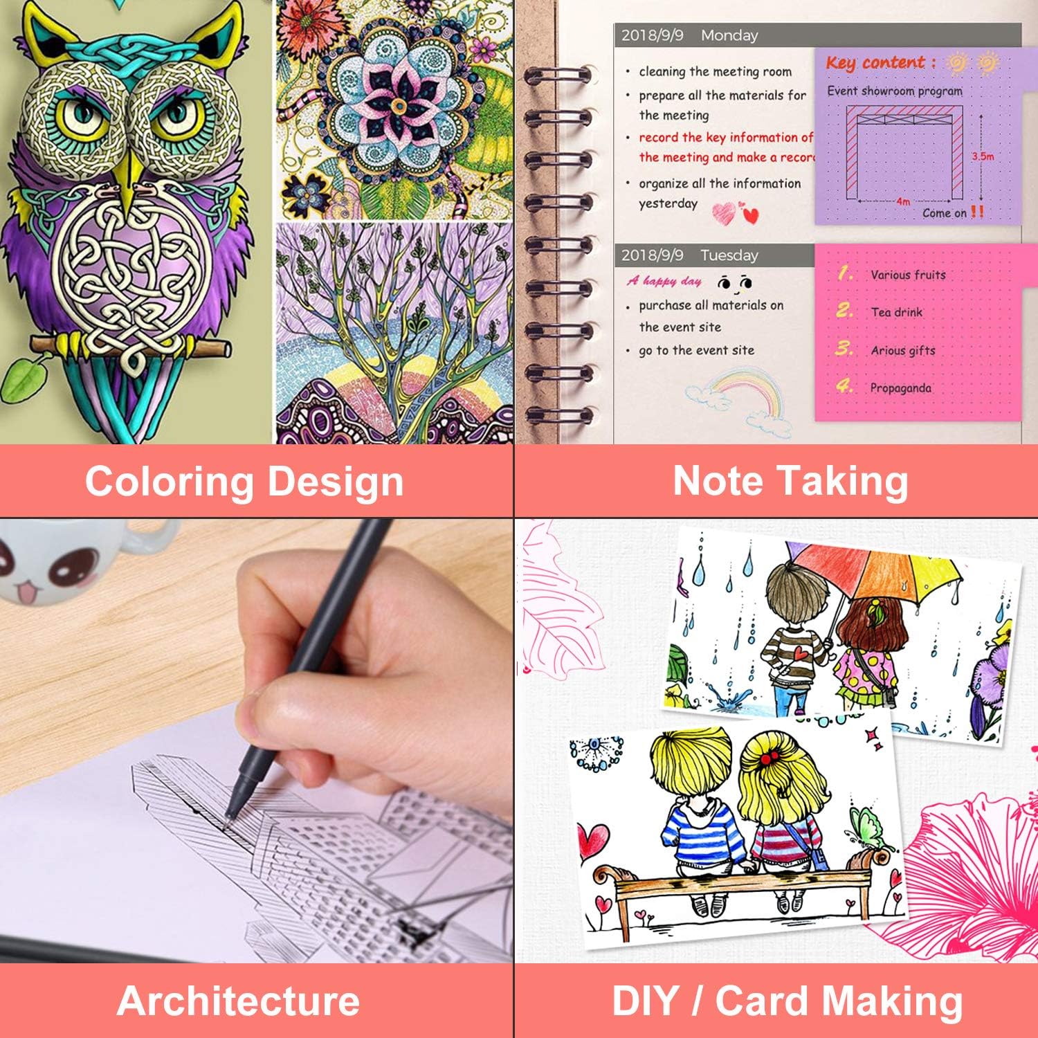 - GREAT marker pens for drawing lines & details, journals, planners, calendars, agenda, notebooks, note taking, painting, writing, coloring, sketching, marker, signing, manga, animation, graphics, design, and illustration, including artists fine-ink drawings and coloring small intricate patterns. Perfect Colored Pens for Middle School, High School, College School, Bachelor, Graduate, Women, Men, and Adult Coloring.