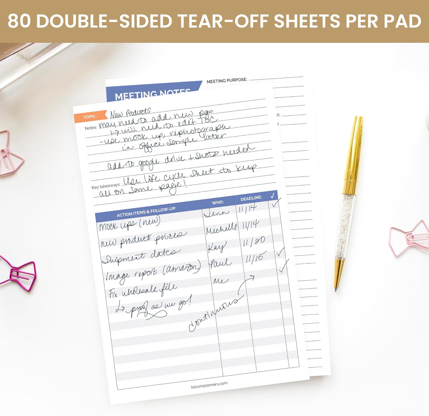 - 80 DOUBLE-SIDED SHEETS / PREMIUM QUALITY: This meeting notebook is crafted with durable 100gsm paper that resists bleed-through, ensuring a smooth writing experience. Its tear-off sheets make it easy to share notes or move on to your next meeting without hassle. Makes a great office gift!