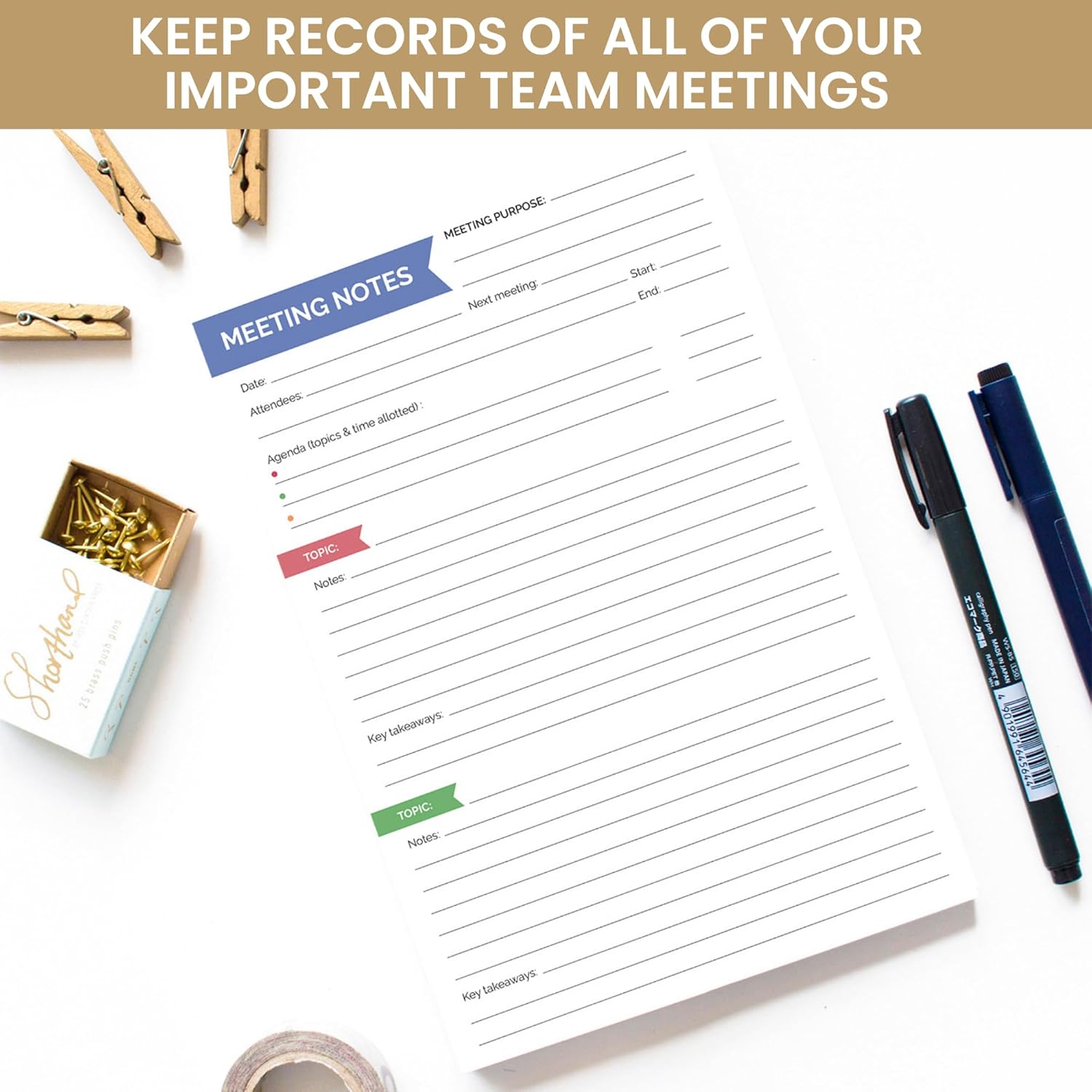 - COLOR-CODED TOPICS & TAKEAWAYS: Dive into three color-coded "Topic" sections, each offering seven lines of note-taking space and three lines to summarize key takeaways for every topic. This layout ensures clarity and prioritization during and after the meeting.