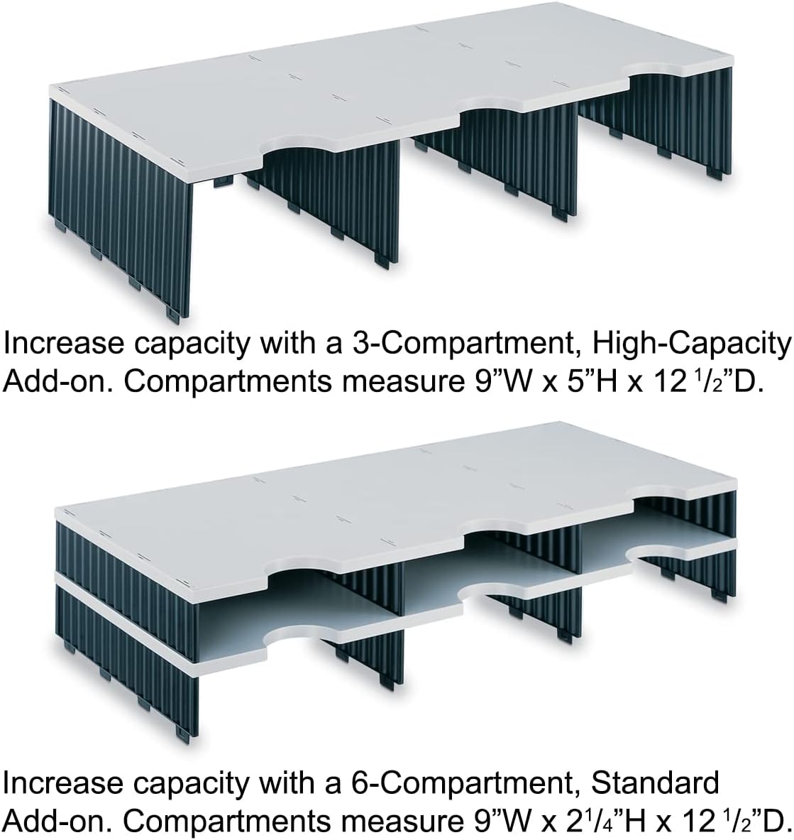 - TIERDROP HIGH CAPACITY COMPARTMENTS - Perfect for storing and organizing bulky items, packages and supplies. Each compartment measures 9 1/16”w x 5"h x 12 3/4"d. Compartments include clear label holders and labels for neat and clean identification.
