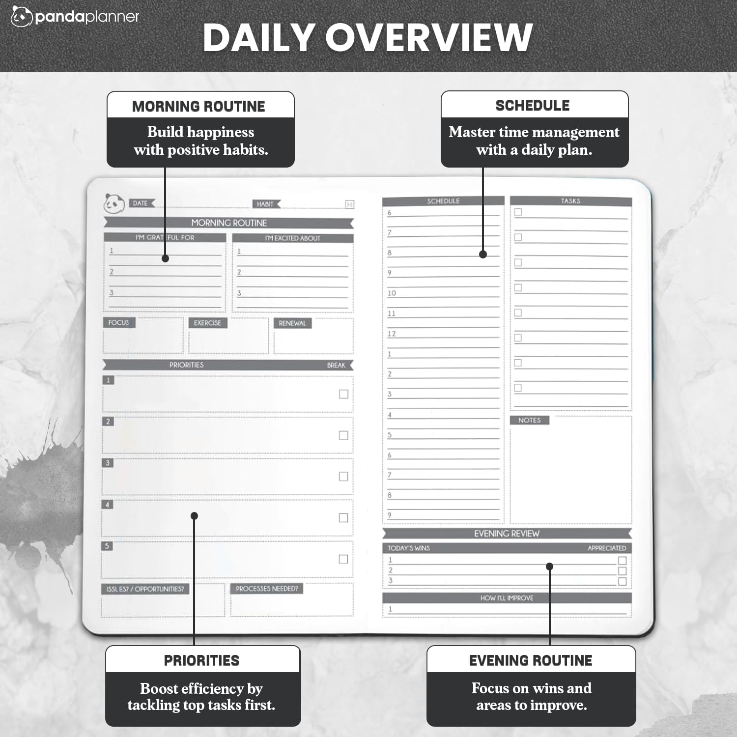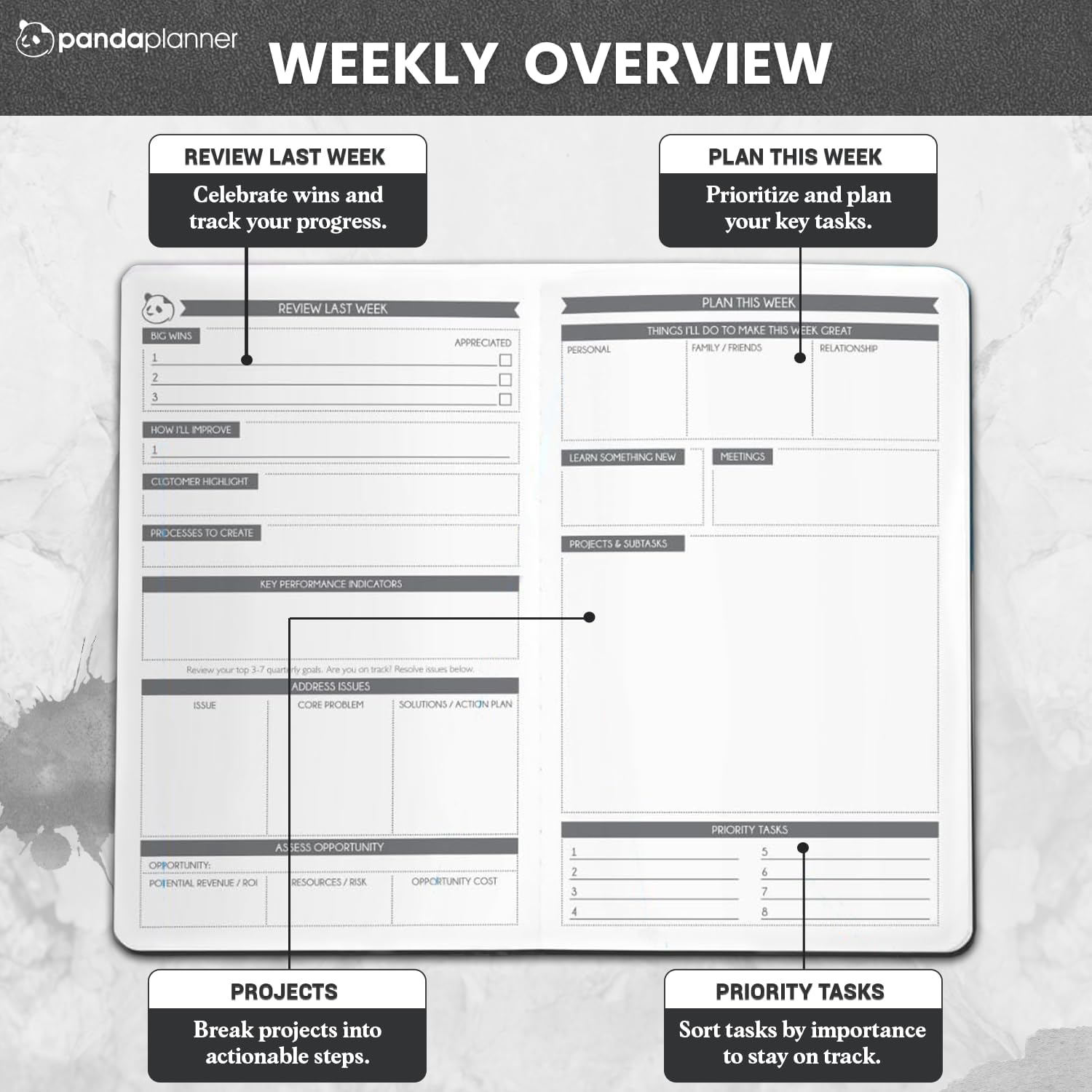 - Your All-In-One Business Organizer: This Panda Planner supports every aspect of work-life success. Use it as a KPI tracker, calendar planner, goal planner, or professional journal. Ideal for meetings, appointments, and big-picture planning—maximize your 90 days with intention.