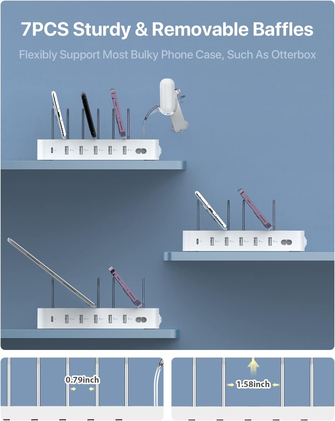 - 〖Removable Dividers & Upgraded 2-In-1 Holder〗With 7pcs Sturdy and removable Dividers,7pcs for phones and tablets,1pcs 2-in-1 new holder for i watch & Air-Pods charger,0.79inch wide space to support more bulky phone cases,like Otterbox.(The i Watch Charger is not included).