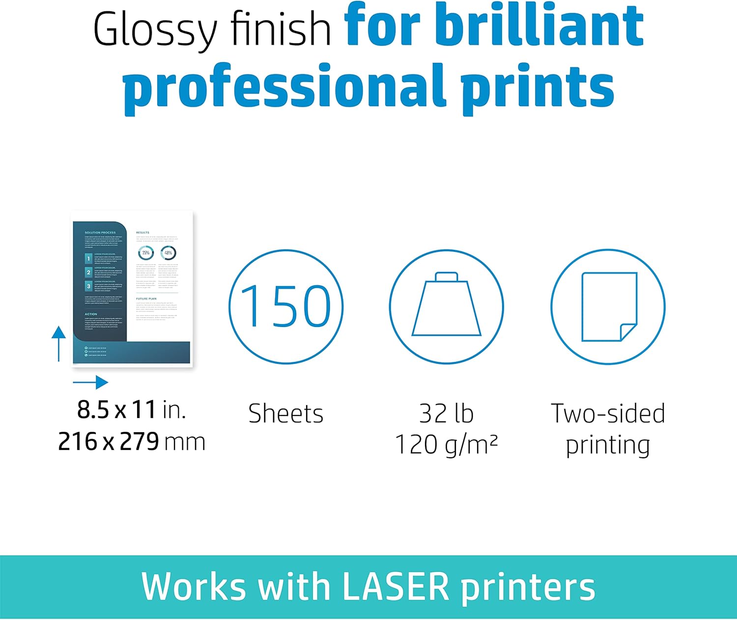 HP Everyday Business Paper, Glossy, 8.5x11 in, 32 lb, 150 sheets, works with laser printers (4WN08A)