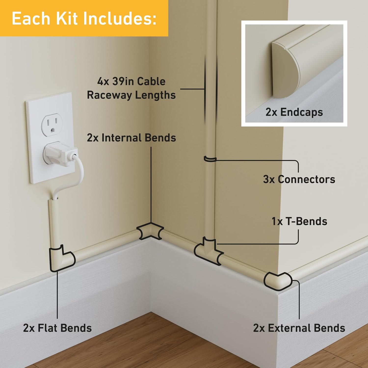 - Accessories included! D-Line Cable Raceway Multipack includes a range of most popular accessories to hide cords around a variety of angles. Bends & Tees have rear grip tabs for secure fittings, design of bends and tees hides imprecise cuts or measurements. Connectors & end caps internal shoulders fit securely under lengths, for a smooth flush finish. All accessories have been color matched to lengths for a perfect finish!