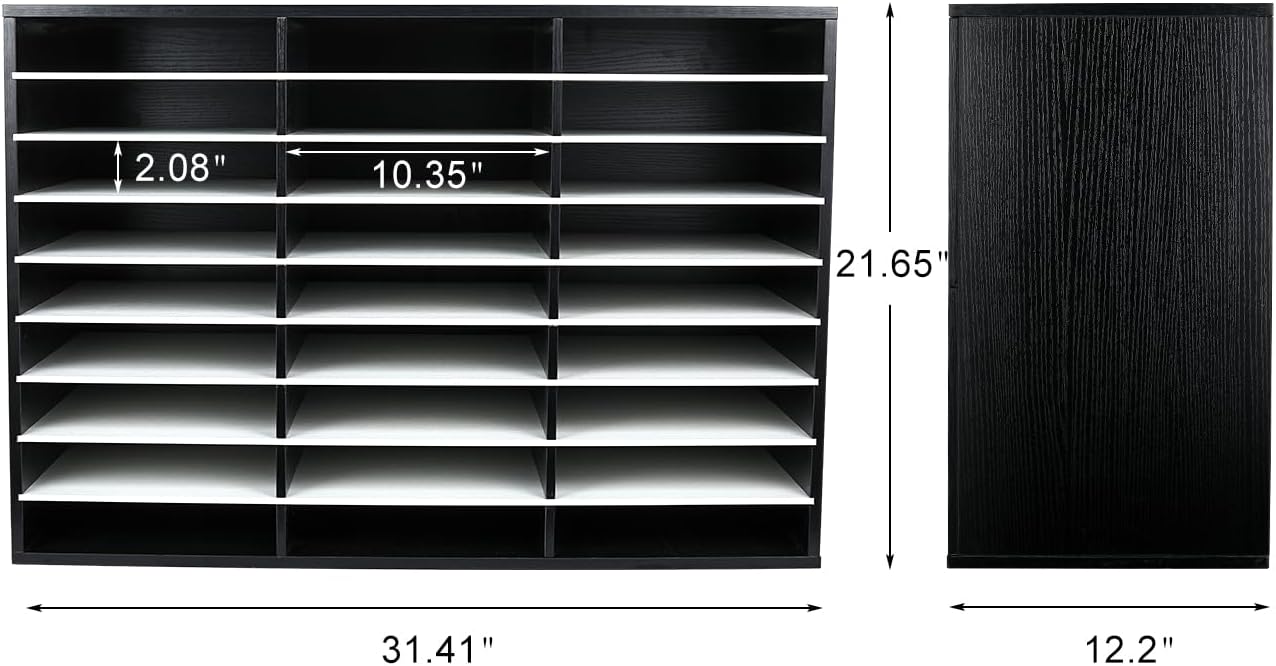 - 27-Compartment Mail Sorter Organizer: Hold 500+ A4 paper sheets in each compartment in this mail organizer. With 27 compartments (12 x 9 x 2.1 inch eash slots), store comics, magazines, and travel brochures effortlessly. EPA-certified particleboard ensures long-term durability for office/classroom use.