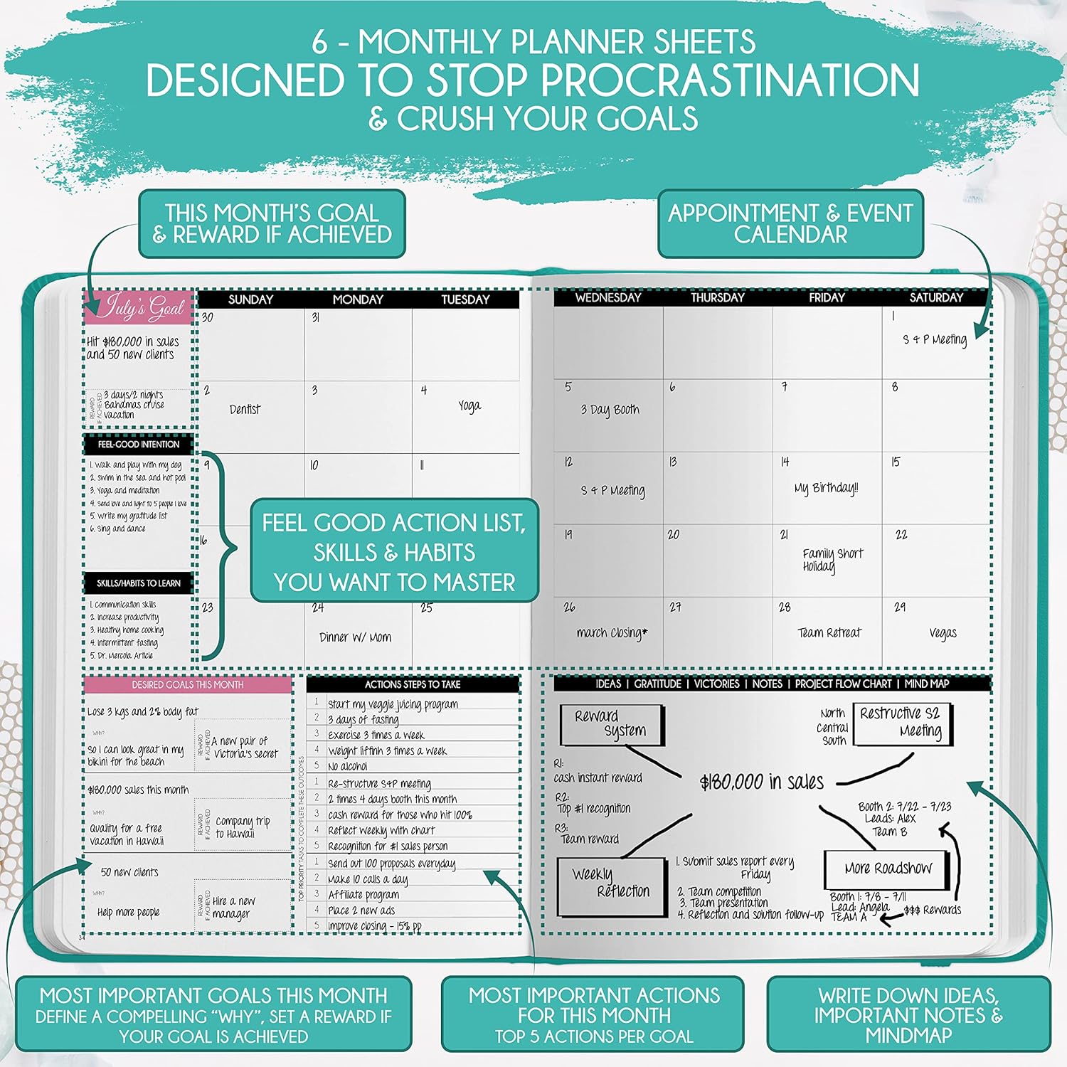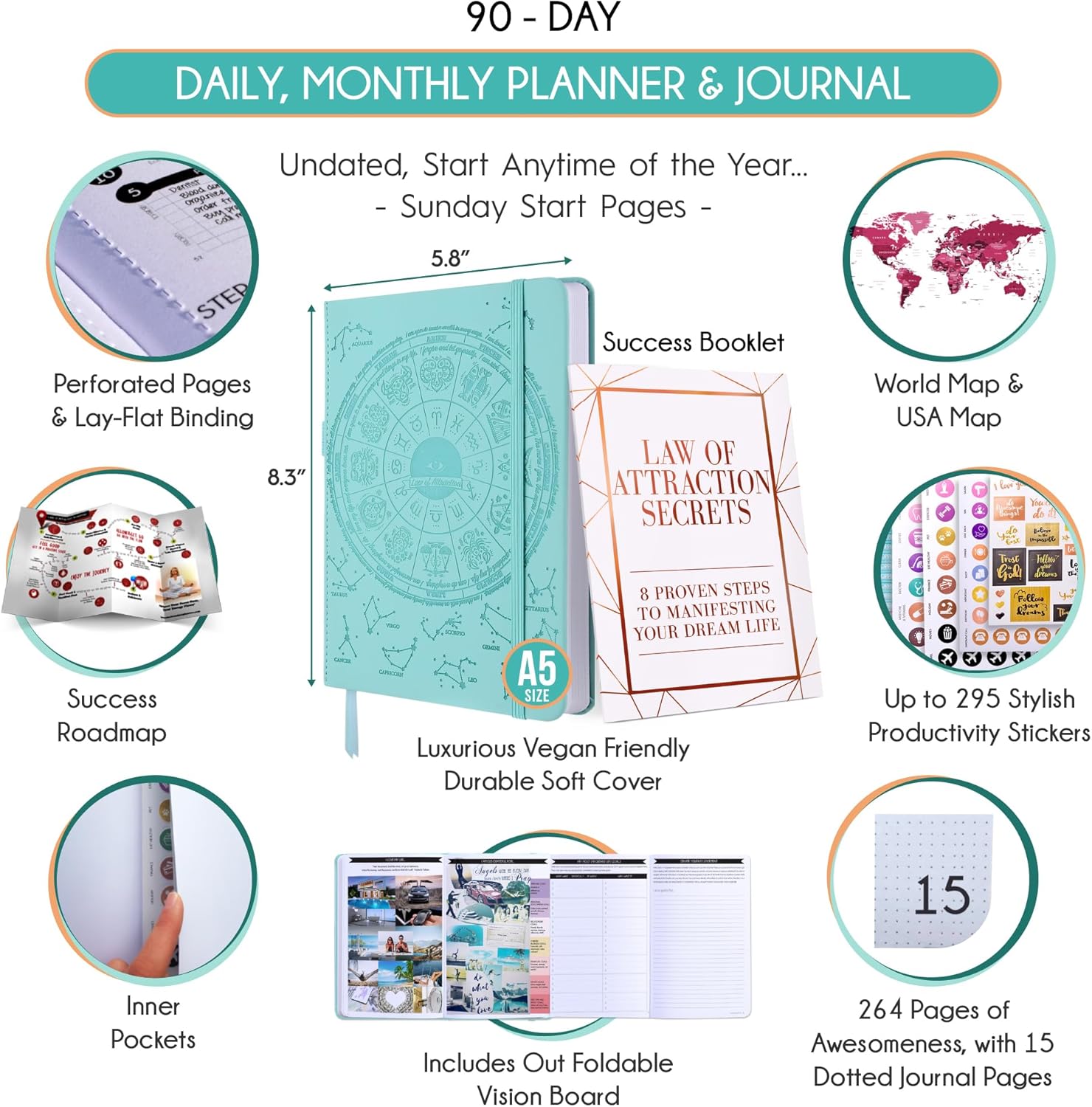 - MANIFESTATION JOURNAL - This deluxe daily planner and gratitude journal for women comes in A5 size (5.8 x 8.3 inches). The life planner comprises 264 pages of thick 100 gsm paper, including 90 daily planning sheets, guiding you on how to become the best possible version of yourself on a mental, physical, and interpersonal level. It's a unique diary based on leading scientific studies proven to increase productivity and happiness. The journal features an out-foldable vision board to help you stay focused, morning and evening power questions, mind maps, reflection pages, habit trackers, a back pocket, and much more than any other planner on the market!