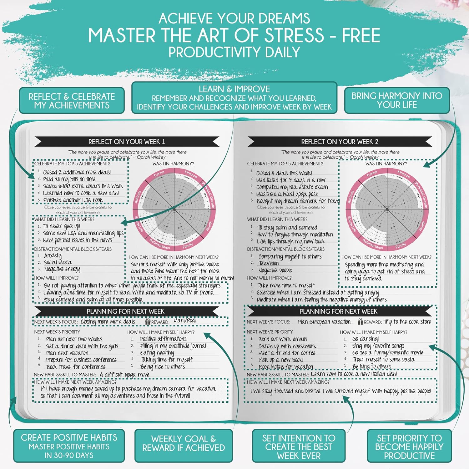 - LUXURIOUS AND TOP QUALITY - Self-care journal for women and men, perfect for entrepreneurs, professionals, college students and everyone who has burning desire to turn dreams into reality! FREE VIDEO MINI-COURSE: You will learn 10-min morning routine used by the most successful people to 10-fold your productivity, focus, happiness & passion! You will master setting goals & fix procrastination!