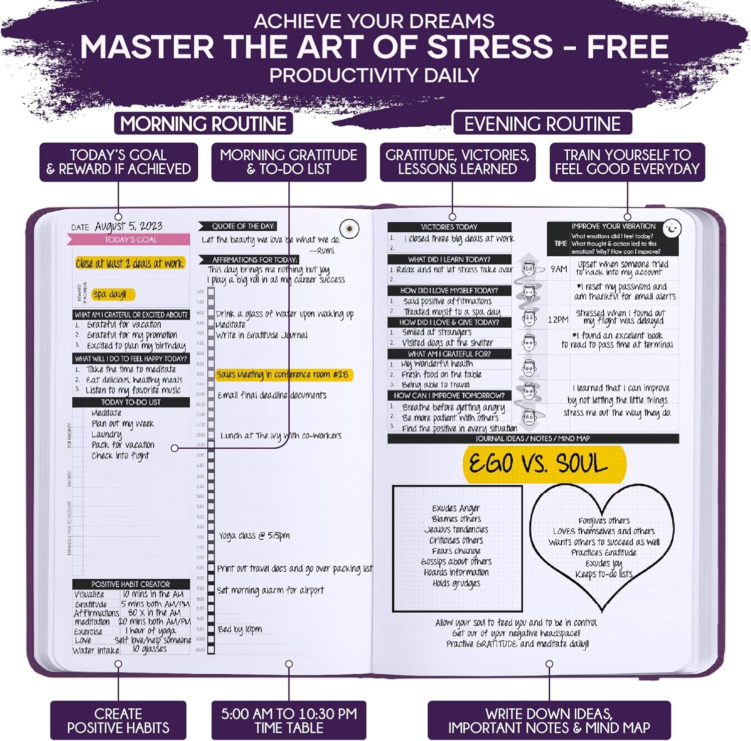 - LUXURIOUS AND TOP QUALITY - Self-care journal for women and men, perfect for entrepreneurs, professionals, college students and everyone who has burning desire to turn dreams into reality! FREE VIDEO MINI-COURSE: You will learn 10-min morning routine used by the most successful people to 10-fold your productivity, focus, happiness & passion! You will master setting goals & fix procrastination!