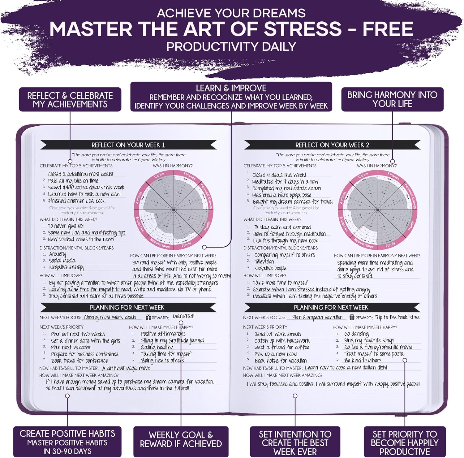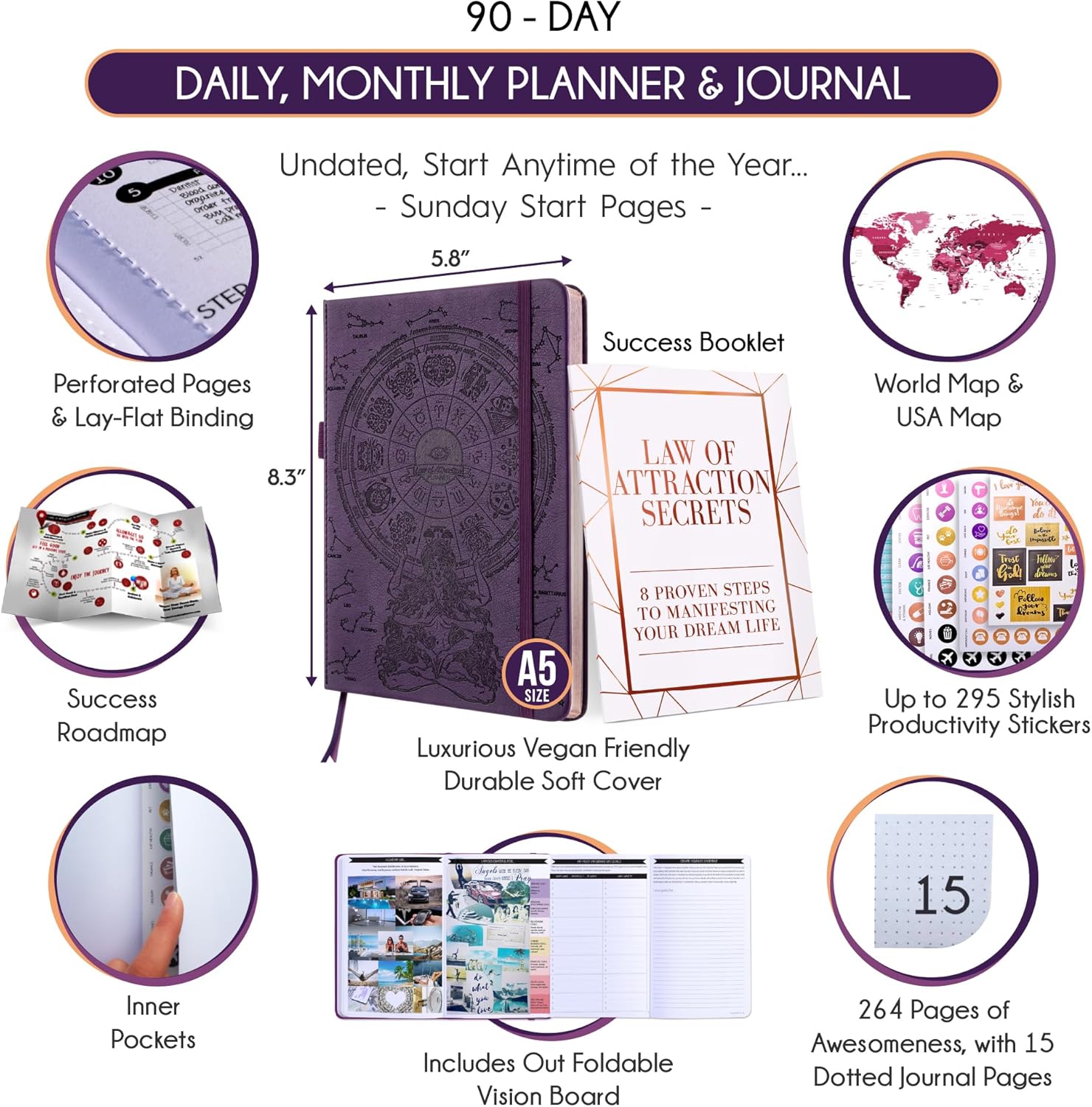 - MANIFESTATION JOURNAL - This deluxe daily planner and gratitude journal for women comes in A5 size (5.8 x 8.3 inches). The life planner comprises 264 pages of thick 100 gsm paper, including 90 daily planning sheets, guiding you on how to become the best possible version of yourself on a mental, physical, and interpersonal level. It's a unique diary based on leading scientific studies proven to increase productivity and happiness. The journal features an out-foldable vision board to help you stay focused, morning and evening power questions, mind maps, reflection pages, habit trackers, a back pocket, and much more than any other planner on the market!