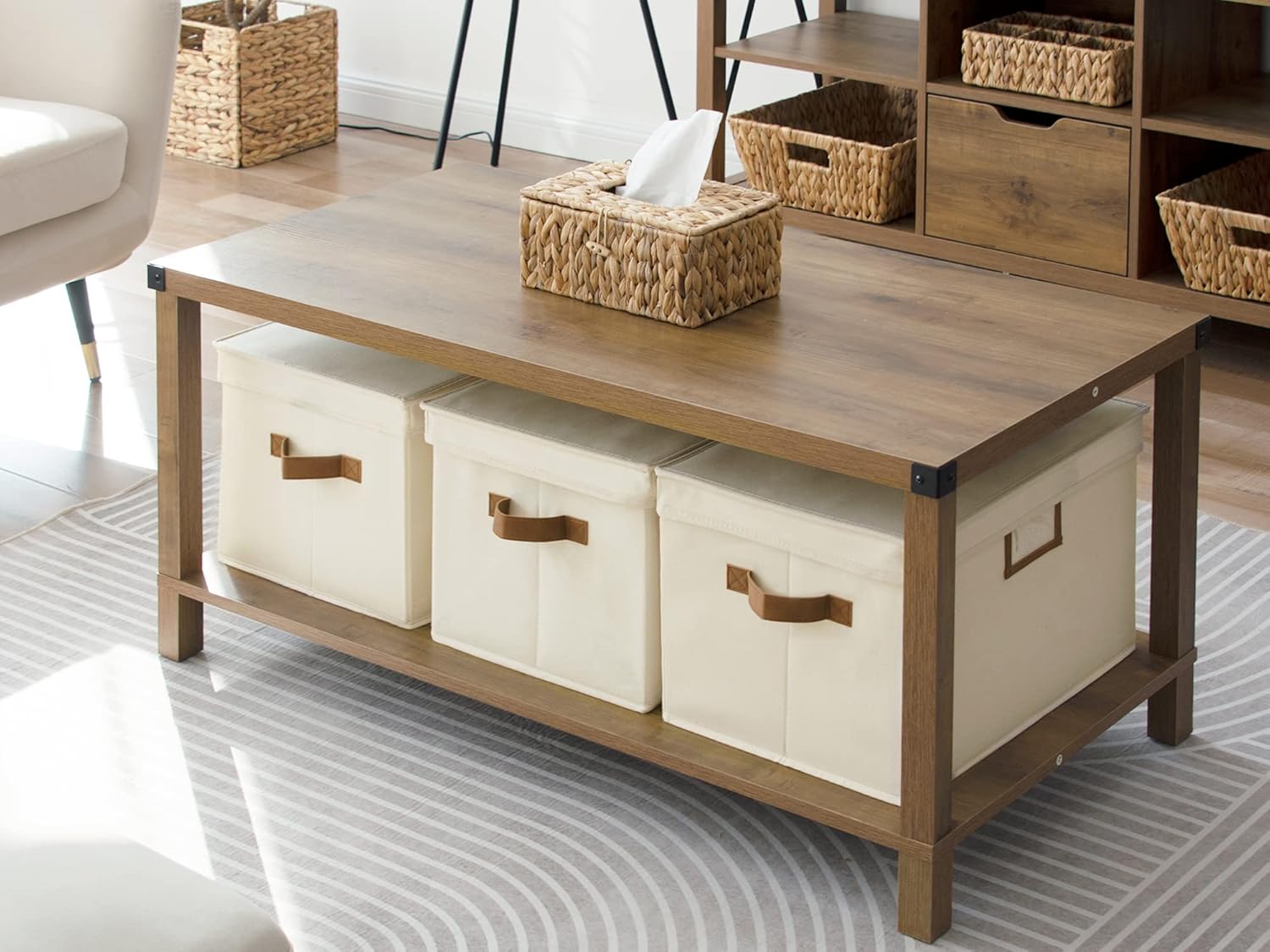 - Storage bins with lids collapsible for space-saving storage.
