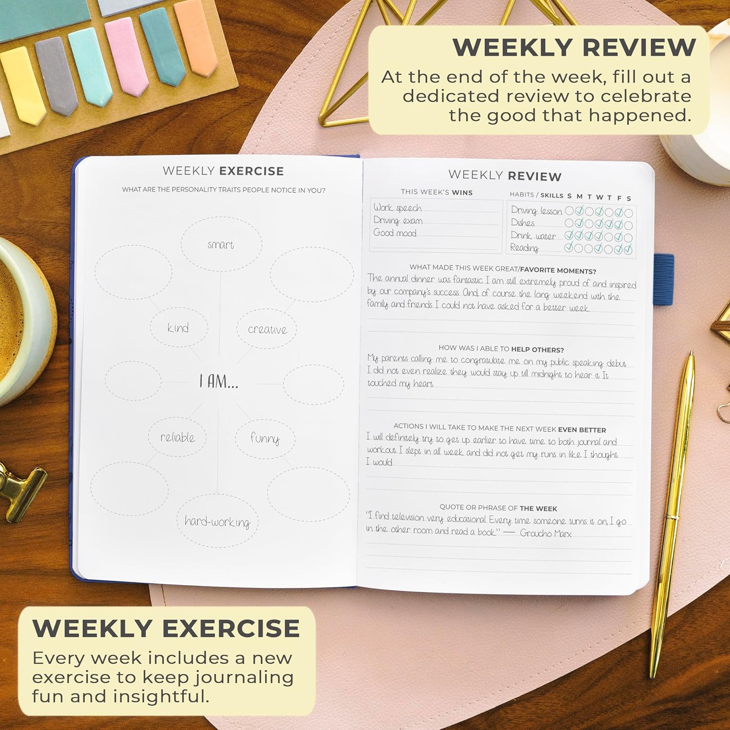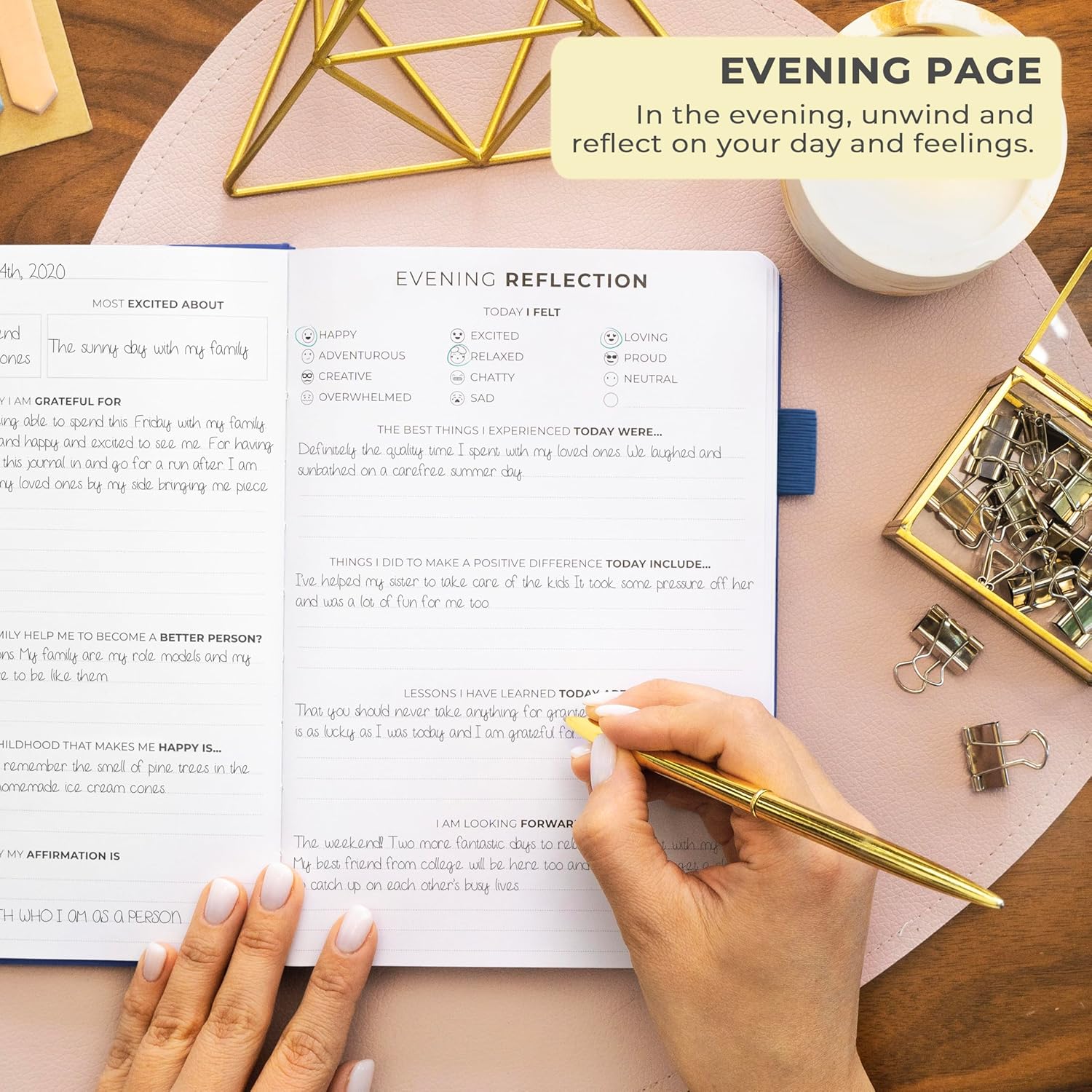 - STIMULATE GROWTH WITH DAILY REFLECTION: Reflect on your day and foster self-awareness with evening reflection pages and regular weekly exercises.
