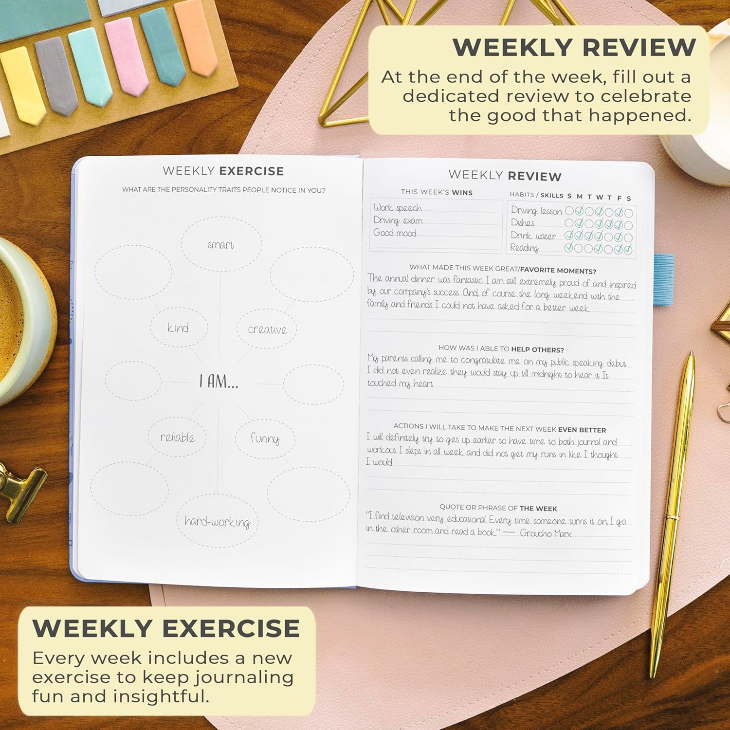 - STIMULATE GROWTH WITH DAILY REFLECTION: Reflect on your day and foster self-awareness with evening reflection pages and regular weekly exercises.