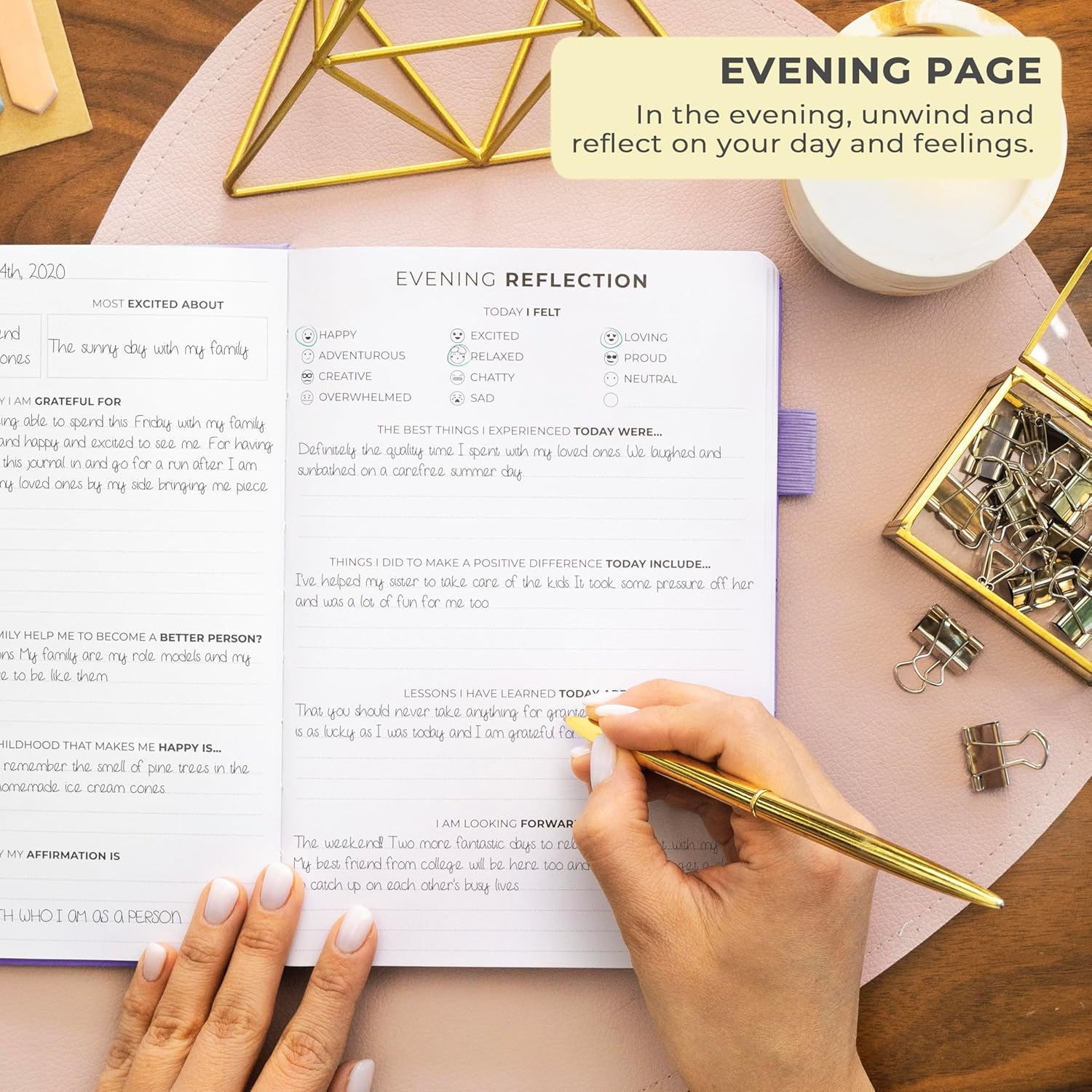 - STIMULATE GROWTH WITH DAILY REFLECTION: Reflect on your day and foster self-awareness with evening reflection pages and regular weekly exercises.