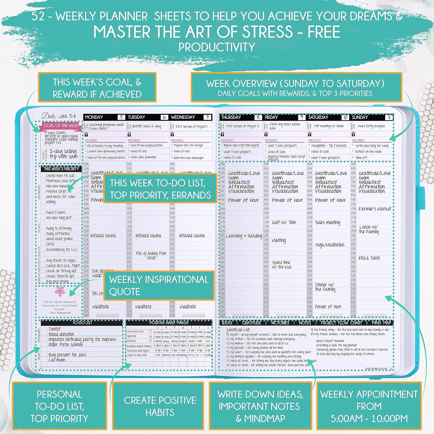 - ACHIEVE YOUR GOALS USING THE LAW OF ATTRACTION - Learn how to set big goals, be happy and manage your time well, and follow the same methods millionaires around the world use to set goals and achieve them. This monthly planner undated planner, life planner, hourly planner, yearly planner, work planner, schedule planner or appointment book. It's a perfect planner for women and men.