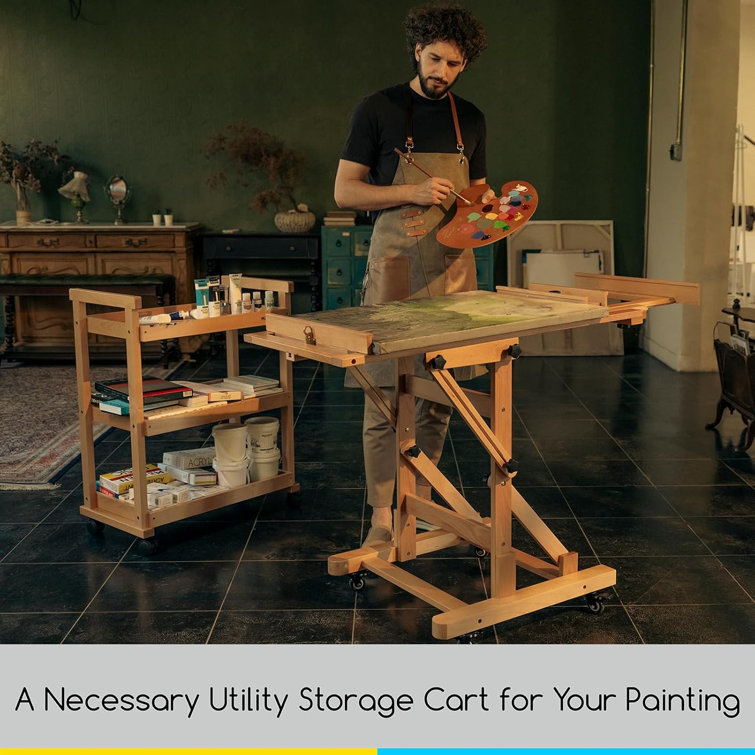 - SOLID BEECHWOOD STUDIO ART CART: The wood storage trolley art cart in size 35'' x 28-1/3'' x 15-3/4'', made of solid beechwood, natural, light-weight, and sturdy. It can hold weight up to 88lbs. Oil finished surface is super smooth and ZERO-glitch. Hand-sanded corners and edges provide maximum security.