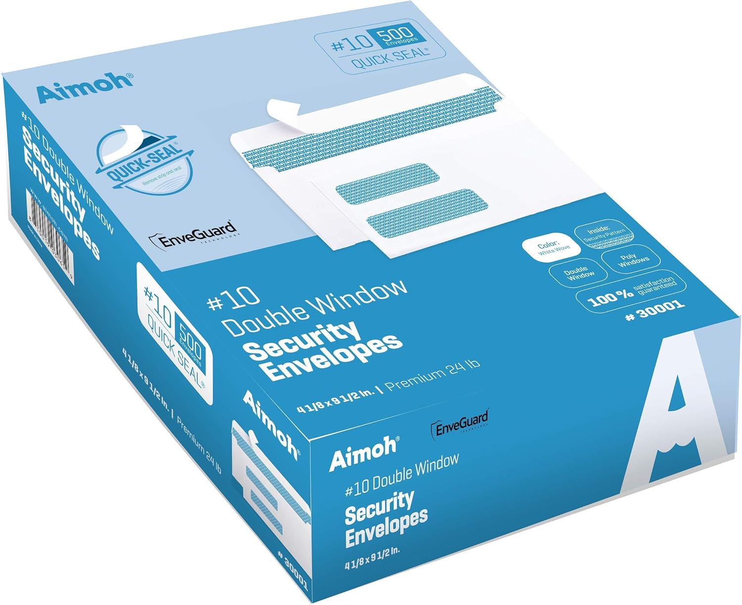 Aimoh 500 Count #10 Double Window Self Seal Security Envelopes - for Invoices, Statements & Business Mailings, Security Tinted - EnveGuard, Size 4-1/8 x 9-1/2 -White -24 LB(30001)