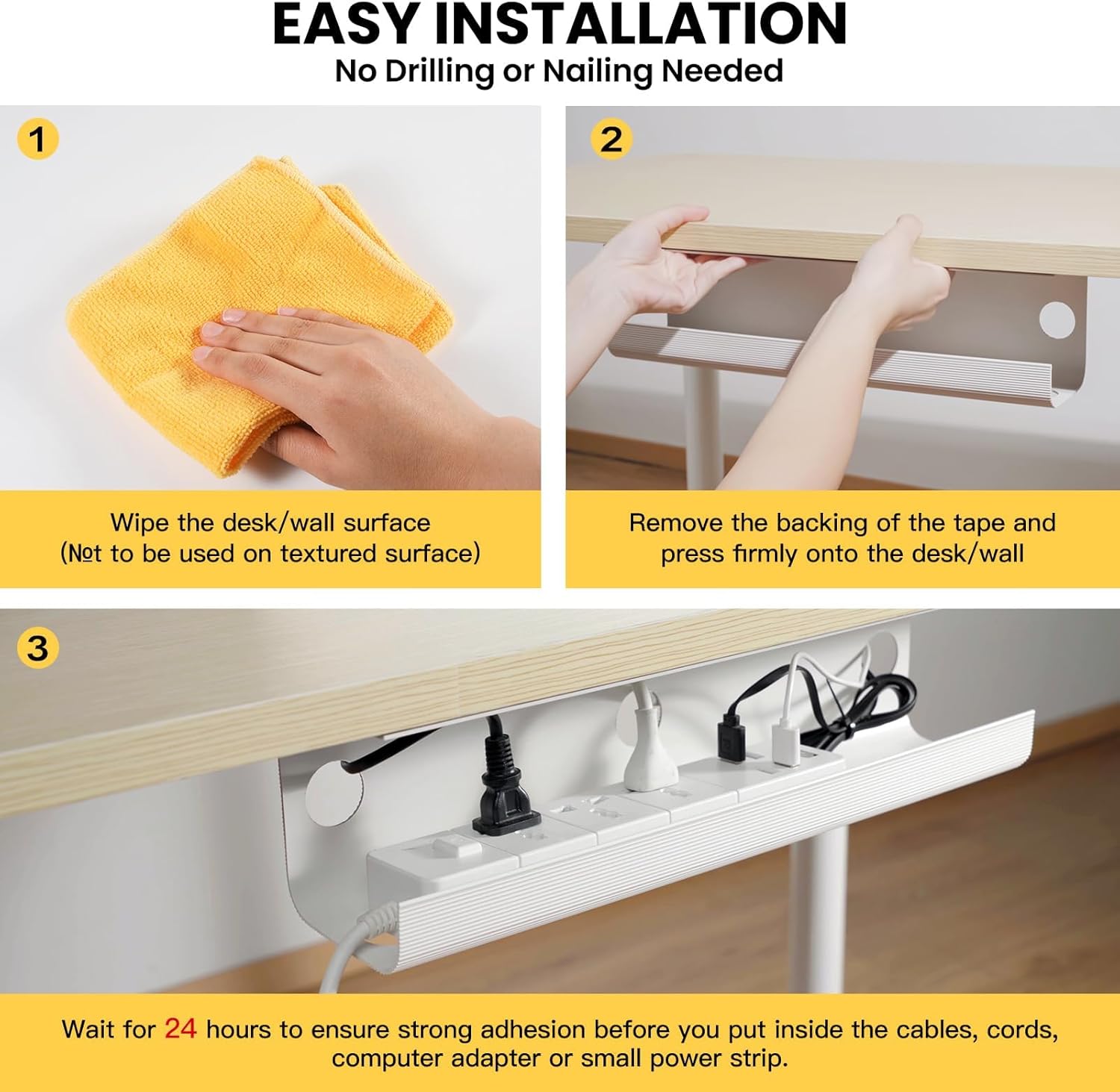 - Innovative Self-Adhesive Solution: With the unique adhesive backing of our under desk cable management U channel, installing our cable management under desk is a breeze. Easily installed by gently peeling off the protective layer and sticking it to a clean, smooth surface. However, to maintain the adhesive bond, avoid installing on moldy, greasy or peeling surfaces. Before applying, make sure the area to be applied is clean. After pressing the desk cable management firmly for at least 10 seconds, allow the adhesive to sit for 24 hours before installing the cable
