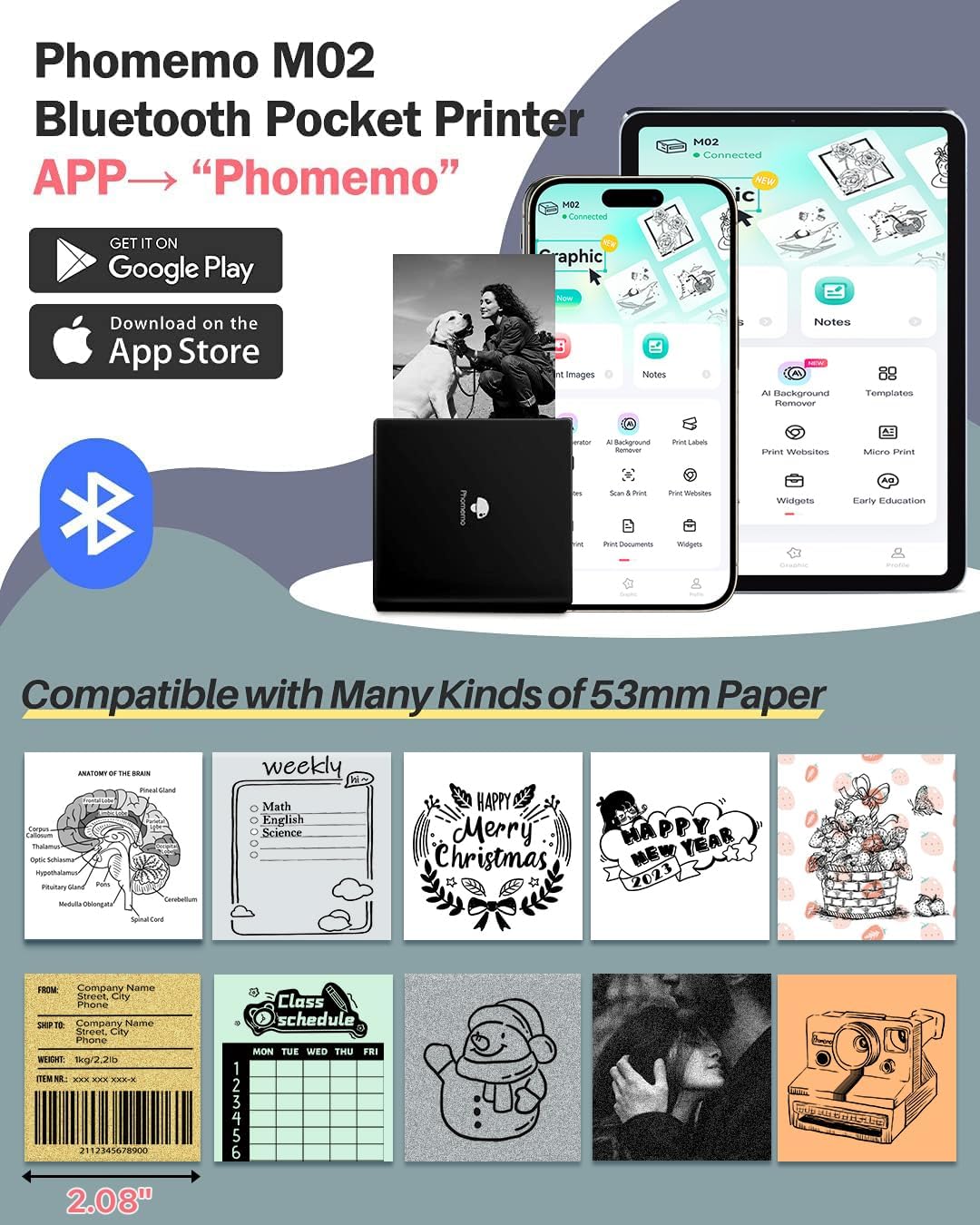 - Bluetooth Mini Thermal Printer- for cell phones and tablets with Bluetooth connectivity, compatible with Android 7.0 and iOS 13.0 or above.The Phomemo M02 sticker printer machine is an inkless wireless printer, you don't need any ink or toner. Not only is it suitable for white self-adhesive and thermal paper (only black and white colors can be printed), but it can also print patterns and text on colored and transparent paper rolls (special paper rolls can be printed in a single color)