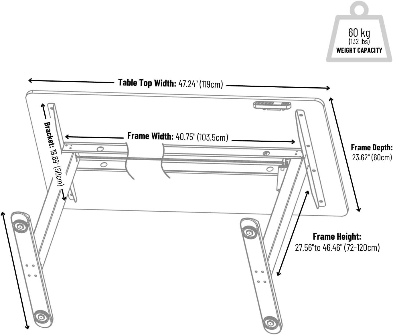 Sit to Stand Electric Standing Desk Complete Set with Frame and Tabletop 120 x 60 cm or 47.2 x 23.6 Inches (Black)