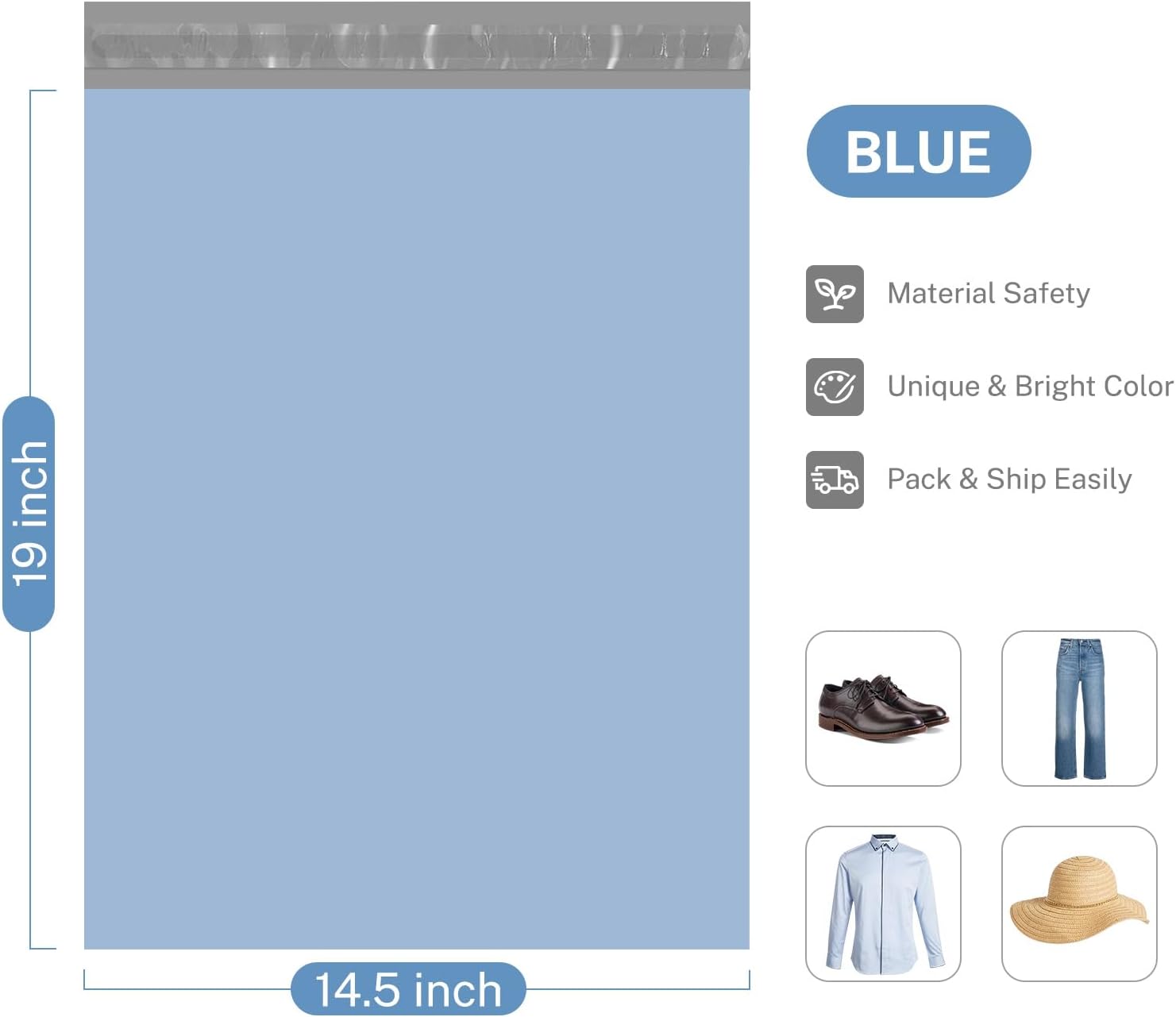 - Inspiring Sky-Blue Color: The sky-blue color of our shipping bag signifies trust, reliability, and calmness, perfect for fostering a positive emotional connection with your customers. This color choice not only makes your packages stand out but also brings a pleasant and comforting experience to the receivers. Enhance your brand image with our emotionally appealing sky-blue poly mailers!
