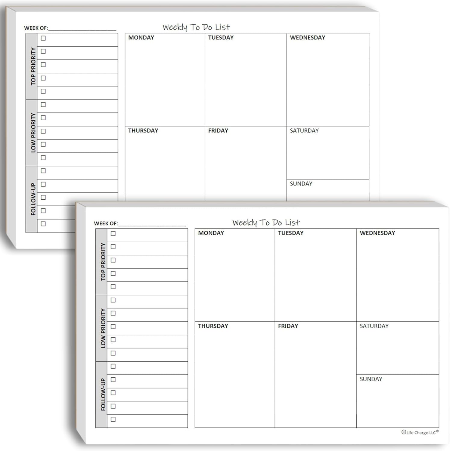 - Weekly To Do List Notepads. Two Pack, 50 Pages Each, Total 100 Pages. Weekly to-do list notepads that house a checklist, a top priority, a low priority, and a follow-up section, along with sections to make notes or appointments on Monday through Sunday. Each notepad has 50 pages. The perfect size, at 8.5 X 5.5 Inch A5 Tear Sheets. Quality 70 pound smooth white paper with chipboard backing. Clean and elegant-looking checklist weekly planner.