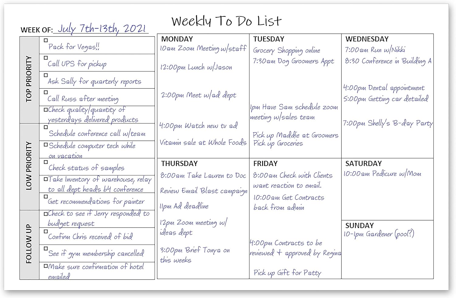 - To Do List Notepad Low and High Priority Section, along with a Follow Up Section. These notepads have a priority section that allows someone to prioritize the order to complete the tasks. Each task has a checkbox next to it for someone to quickly check the box to indicate the job has been completed. Nice to be able to see how much has been completed at a glance. Monday through Sunday, areas to make notes or indicate appointments or obligations.