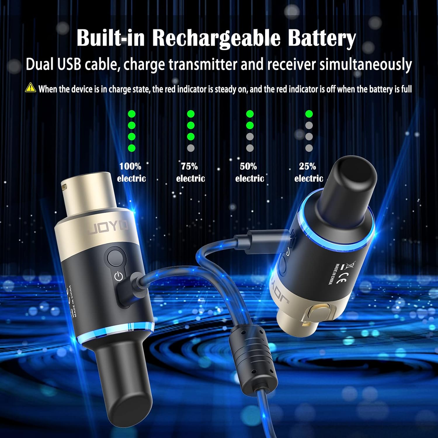 - Make your Professional Microphone Wireless - JOYO wireless microphone transmitter receiver is compact and portable, let you get rid of XLR cables forever! Built-in rechargeable battery and power indicator light, battery life is a decent 3.5-5 hours (It depends on what you use it for), and you can also charge both the receiver and transmitter at the same time.