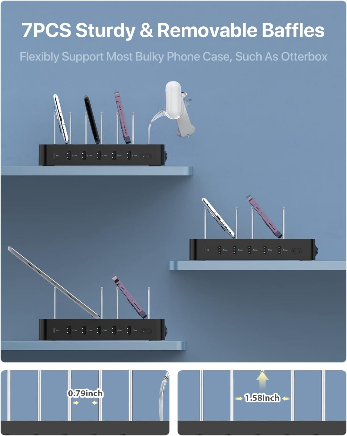 - 〖Removable Dividers & Upgraded 2-In-1 Holder〗With 7pcs Sturdy and removable Dividers,7pcs for phones and tablets,1pcs 2-in-1 new holder for i watch & Air-Pods charger,0.79inch wide space to support more bulky phone cases,like Otterbox.(The i Watch Charger is not included).