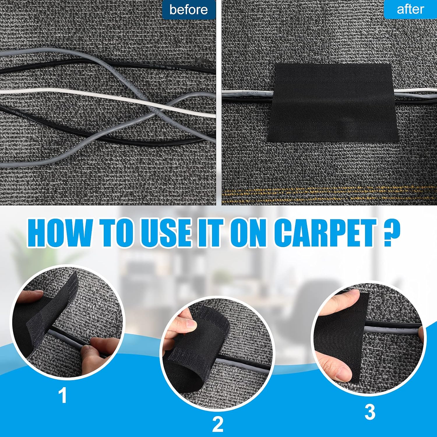 - Easy to use: the floor strip is designed in hook and loop design, grips well and easy for cutting to the length that you require; Pinch cables, just lay on the carpet, simple 3 steps, its over