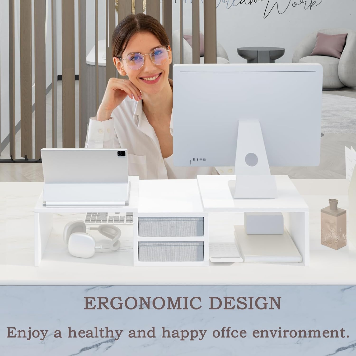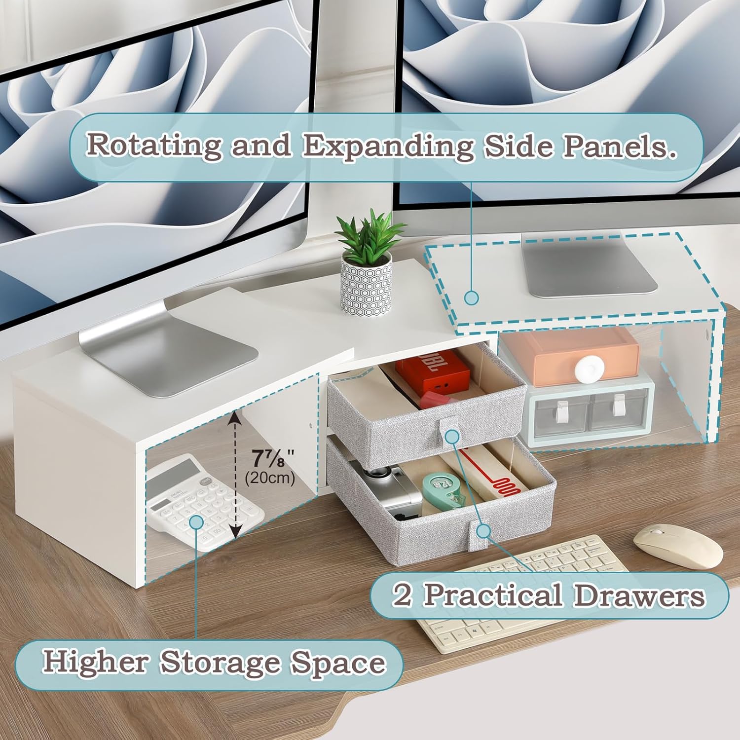 TEAMIX Dual Monitor Stand Riser with 2 Drawers - Length and Angle Adjustable White Monitor Stand with Storage Large Computer Riser for 2 Monitors/Laptop/PC, Wood Screen/TV Stand Desk Organizer