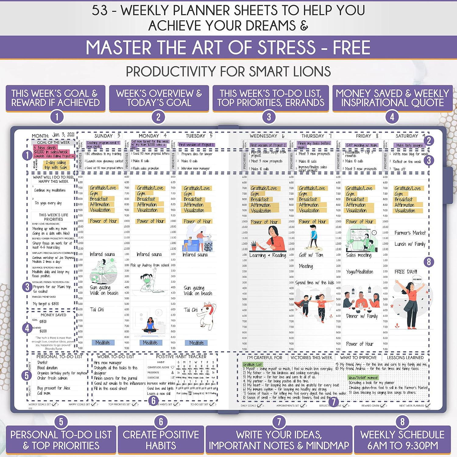 - HABIT TRACKER JOURNAL - Reduce overwhelm, tension, and procrastination by using a groundbreaking 8-step technique to reclaim your life's balance, clarity, and serenity while achieving your goals. Seize the potential of each day. This personal organizer dedicates a separate page for every day, featuring sections for scheduling, goal setting, prioritization, task lists, reflection, and ample space for notes. With its expansive large format, you possess all the room necessary for comprehensive planning.