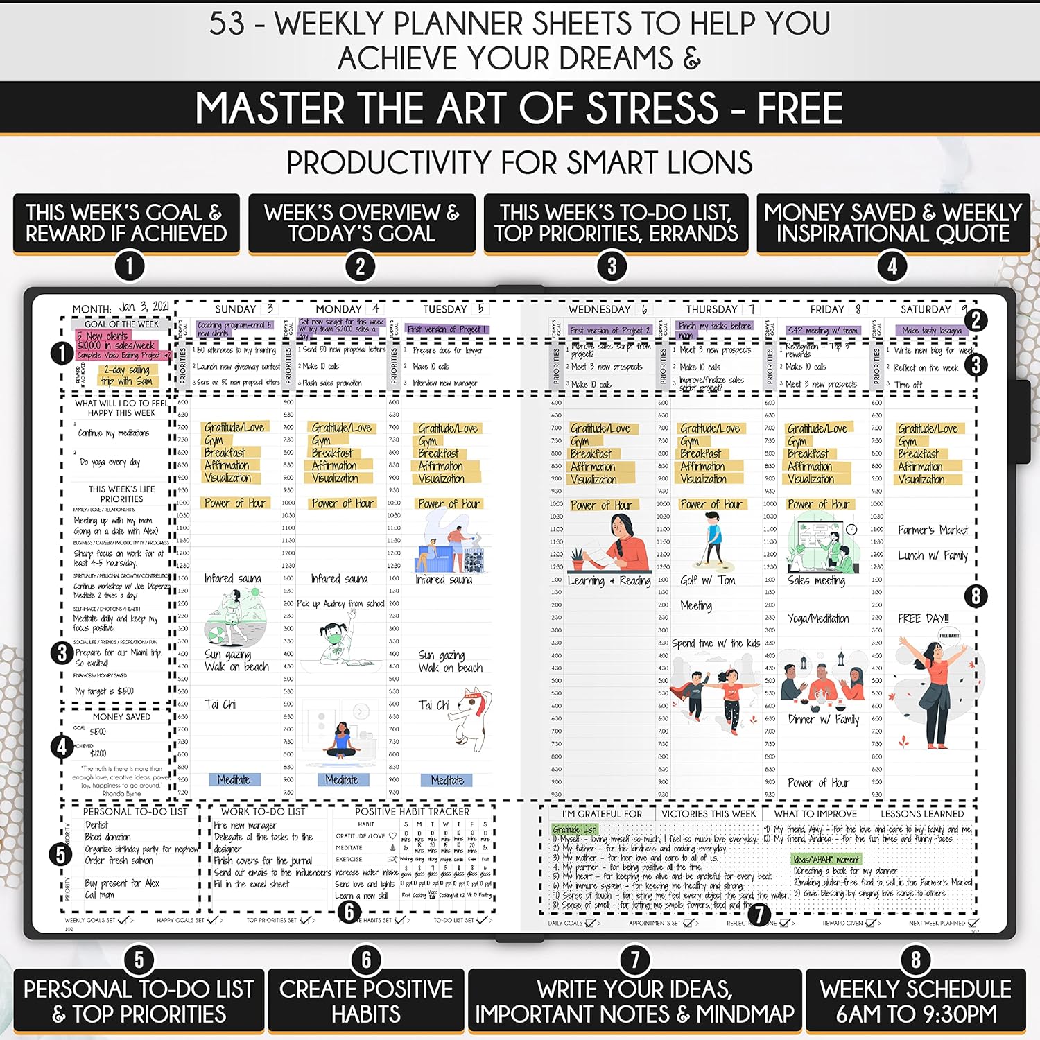 - LIFE PLANNER - A5 Size, 212 pages of life transformation, 53 weekly, 12 monthly planning overviews & reflection, 22 dotted journal pages, habit trackers, mind maps, morning & evening routines, inner pockets, pen holder & gift box