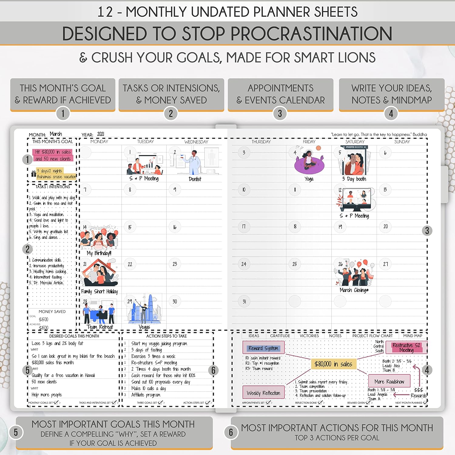 - UNDATED PLANNER - All the tools for success you need to create the life you've always wanted. This planner measures A5 (6 x 8.5 inches) and boasts thick 100 gsm paper. It features a Horizontal Planner layout, offering 212 pages for life transformation, including 53 weekly spreads, 12 monthly planning overviews with reflection sections, 22 dotted journal pages, habit trackers, mind maps, morning and evening routines, inner pockets, pen holder, and comes in a gift box. This life planner is undated, serving as a daily, weekly, and monthly planner, giving you the freedom to start your journey whenever it suits you best.