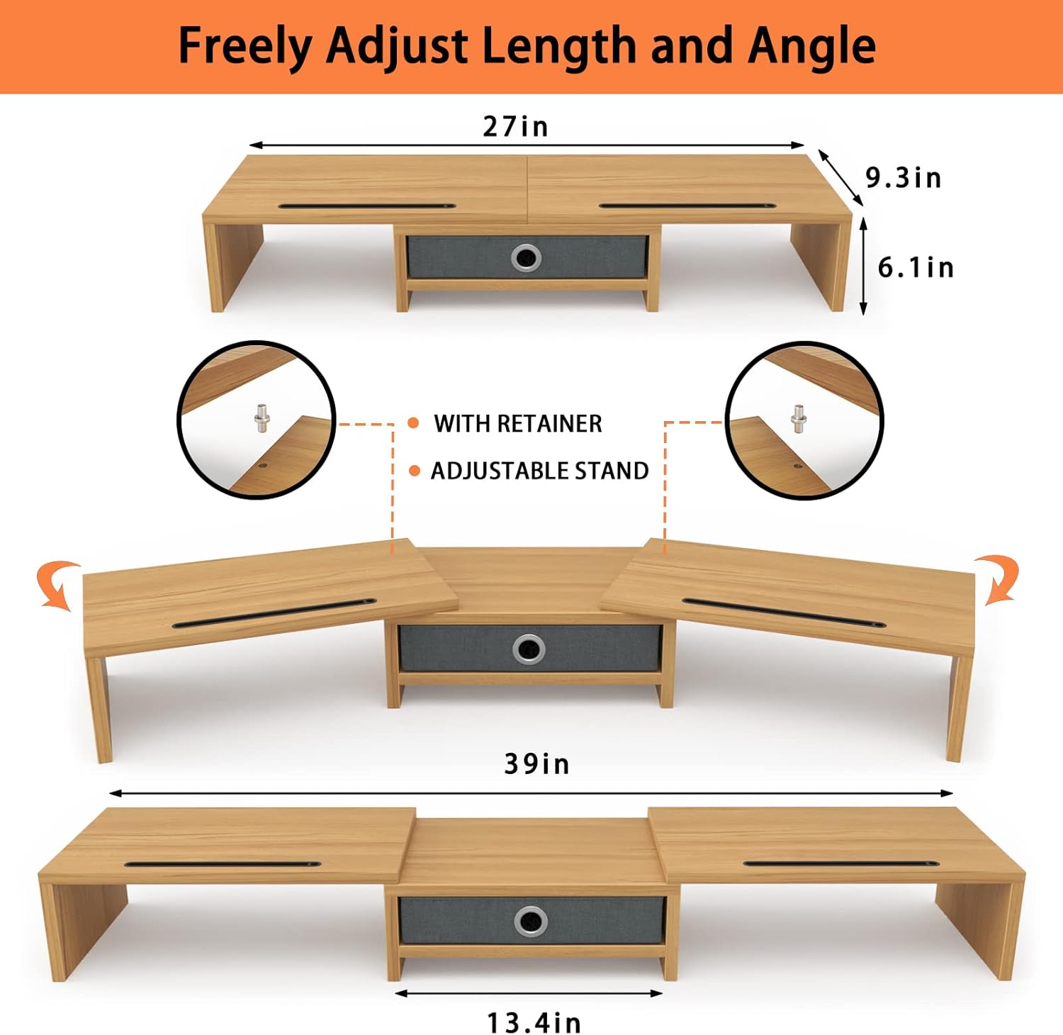 WESTREE Dual Monitor Stand Riser with Drawer - Adjustable Length and Angle, 2 Phone Hold, Desktop Organizer for Computer/Laptop/PC/Printer