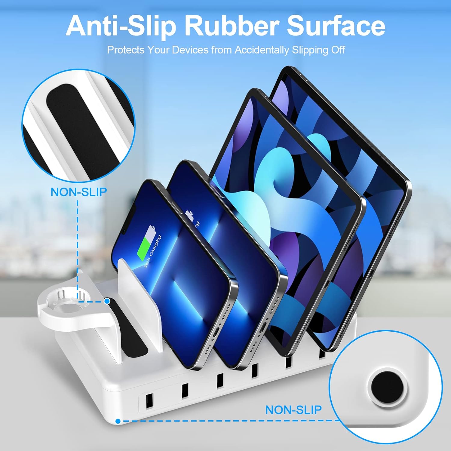 - Sturdy & Durable: The multi charger station is made of high-quality flame retardant ABS material, anti-slip rubber surface protects your devices from accidentally slipping off. 1-inch wide slot and 1.3-inch high divider are strong enough to handle a large tablet with a thick case. Our charging station for multiple devices is lightweight and easy to carry for traveling purposes
