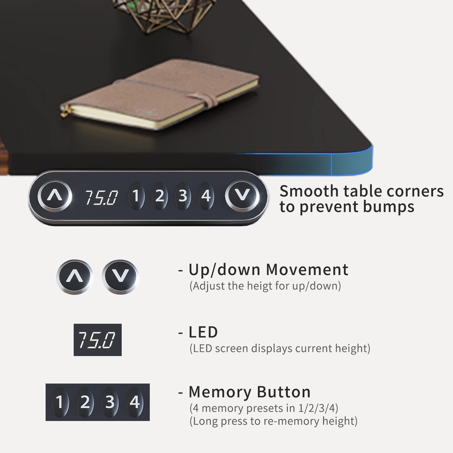 - Anti-collision technology and power protection: The standing desk has anti-collision technology and power protection. The built-in sensor achieves higher sensitivity, allowing it to accurately detect obstacles and automatically lower 2 cm when encountering obstacles. If error codes appear, you can reset them.