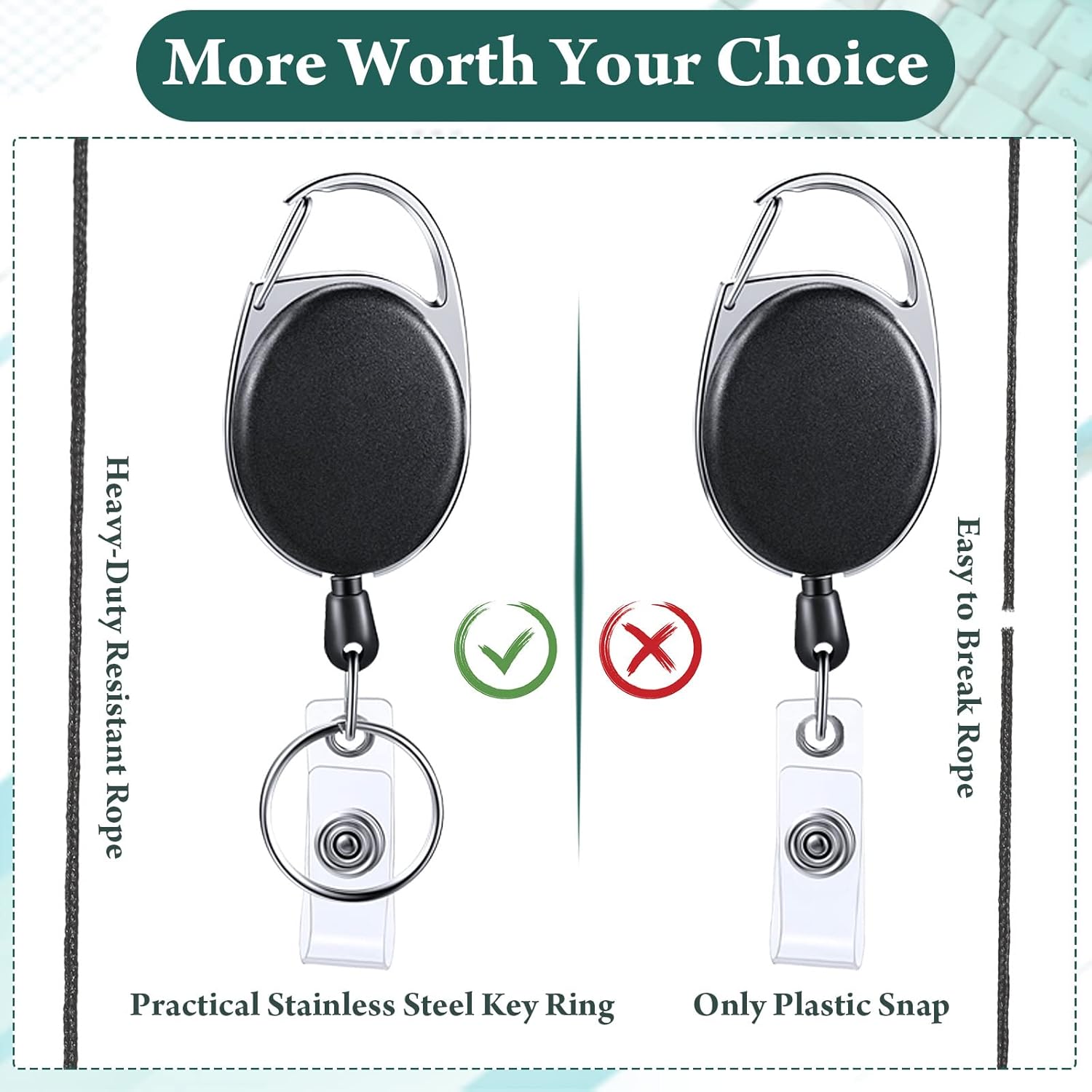 - Package: you will get 50 packs of retractable badge clips, featuring clip, stainless steel key ring, vinyl snap strap and plastic cover, clip attachment for effortlessly and quickly fastening to belt loops, straps, backpacks, bags and more, allow a quick and easy way to scan or swipe your badge