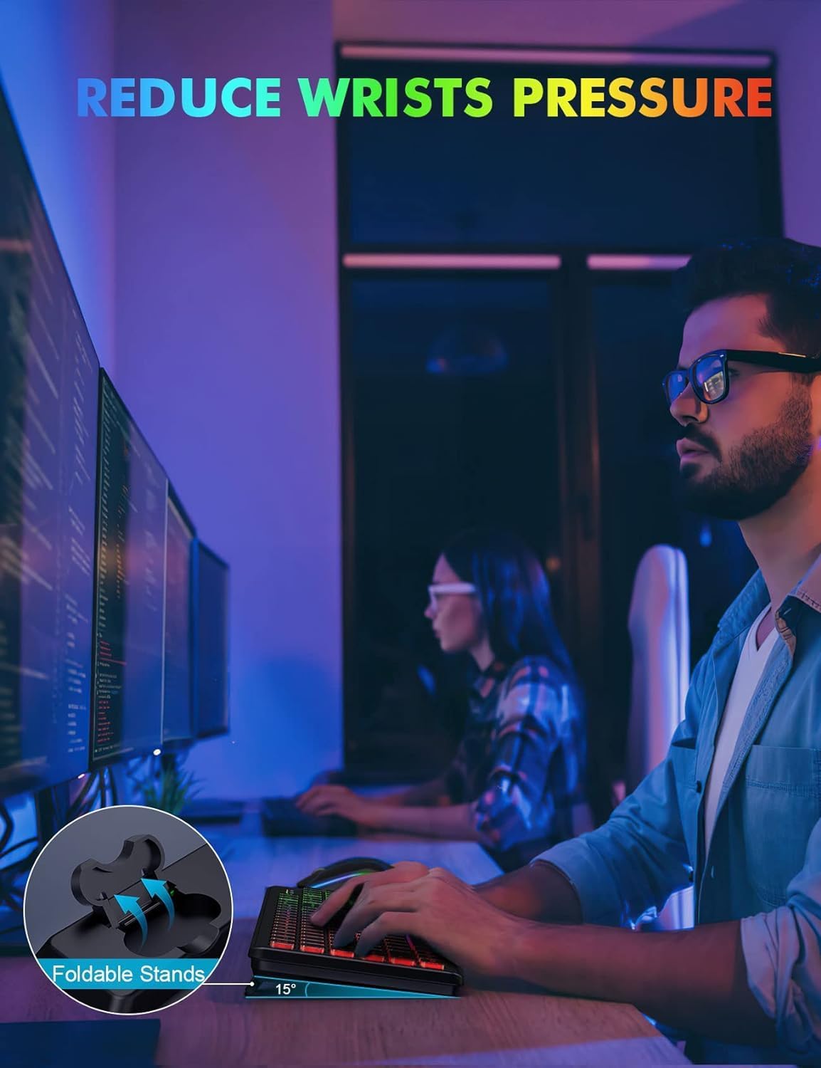 - COMFORTABLE TYPING & SILENT CLICK - The foldable stands offer a tilt angle for a better typing position. The effortless crater mechanism under each key makes typing more comfortable. The mouse and keyboard are almost silent, don't worry about disturbing others.