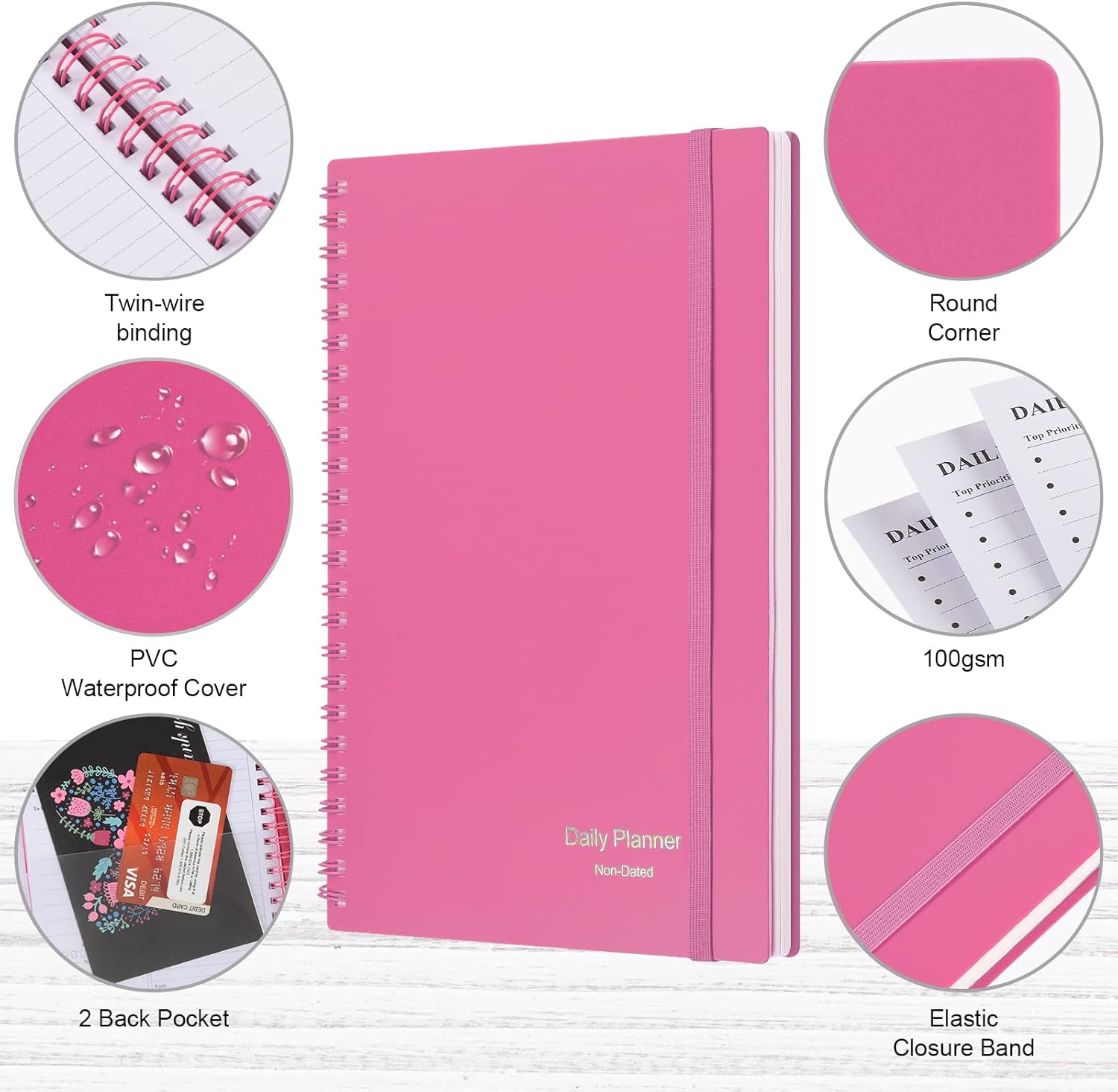 - Funtional Details:Sturdy PVC cover help protect the planner,elastic band keep the notebook close nicely or you can use the elastic closure to mark your page, two pocket in the back stroage your note receipts and cards๏ผtwin-wire binding allows turning pages smoothly and laying flat.