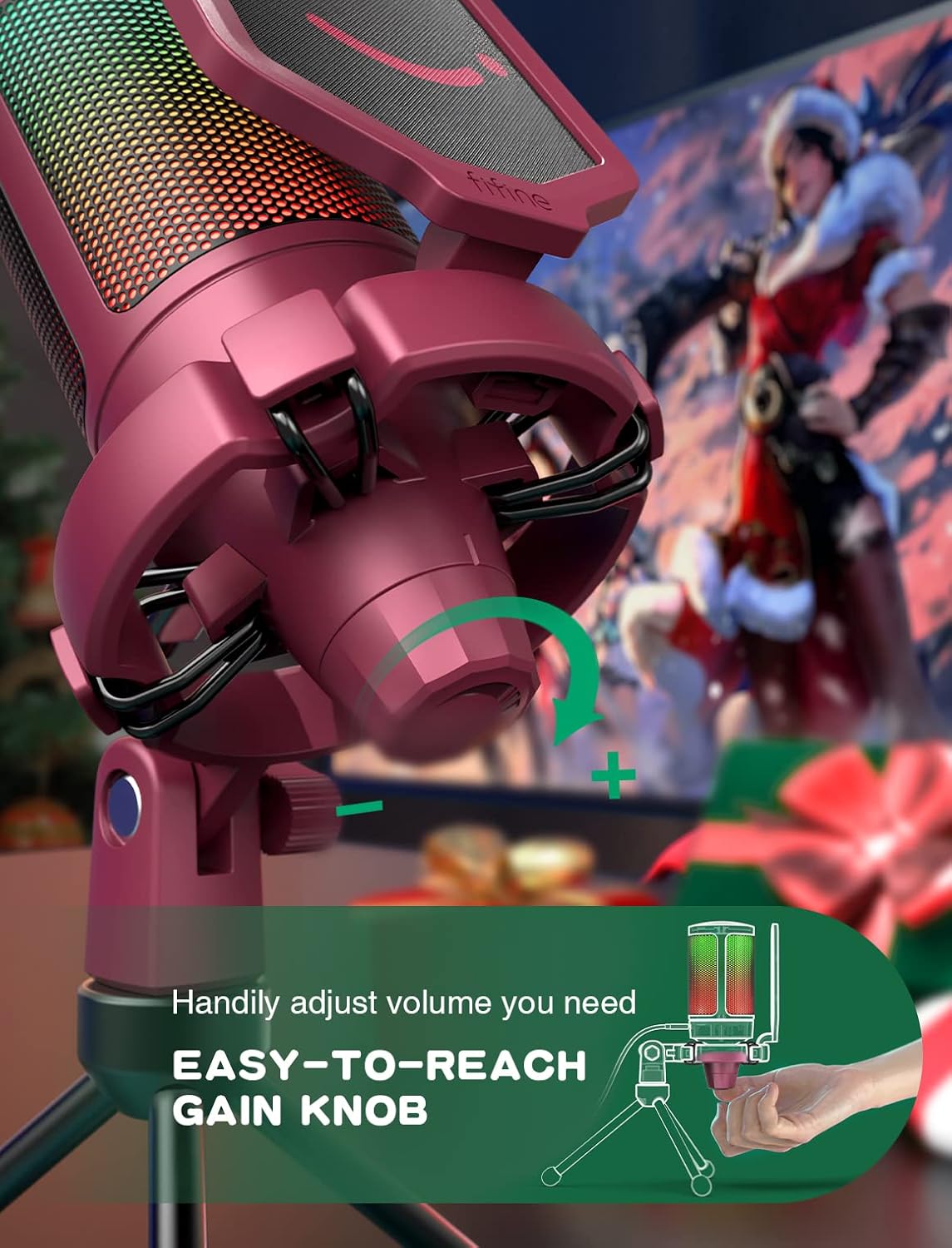 FIFINE AmpliGame PC Gaming Streaming USB Microphone, RGB Desktop Microphone for Computer/Mac/PS4/PS5, Podcast, Recording, TikTok, Game Chat, Condenser Mic with Pop Filter, Shock Mount - Red