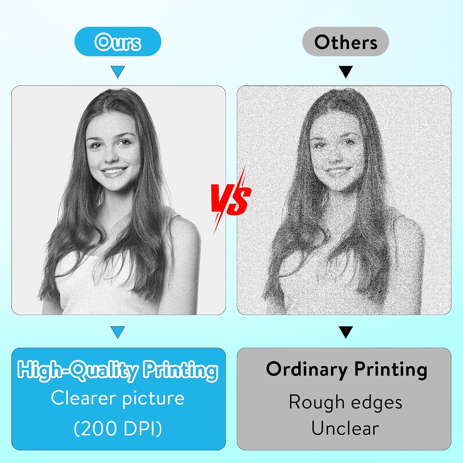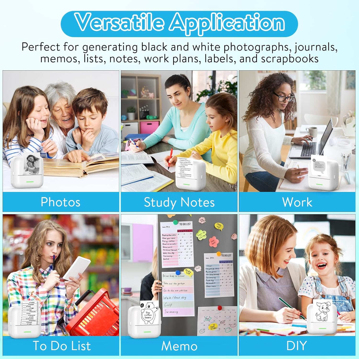 - Multipurpose & Perfect Present: This inkless printer for printing black and white photos, memos, labels, cute pet stickers, QR codes, etc. Information and images on the phone screen can be printed instantly. If you need a clearer print, please select the original image and darken the print. Improve efficiency by helping you organize and summarize work plans, shopping lists, and more. The ideal birthday, anniversary, Christmas present for anyone.