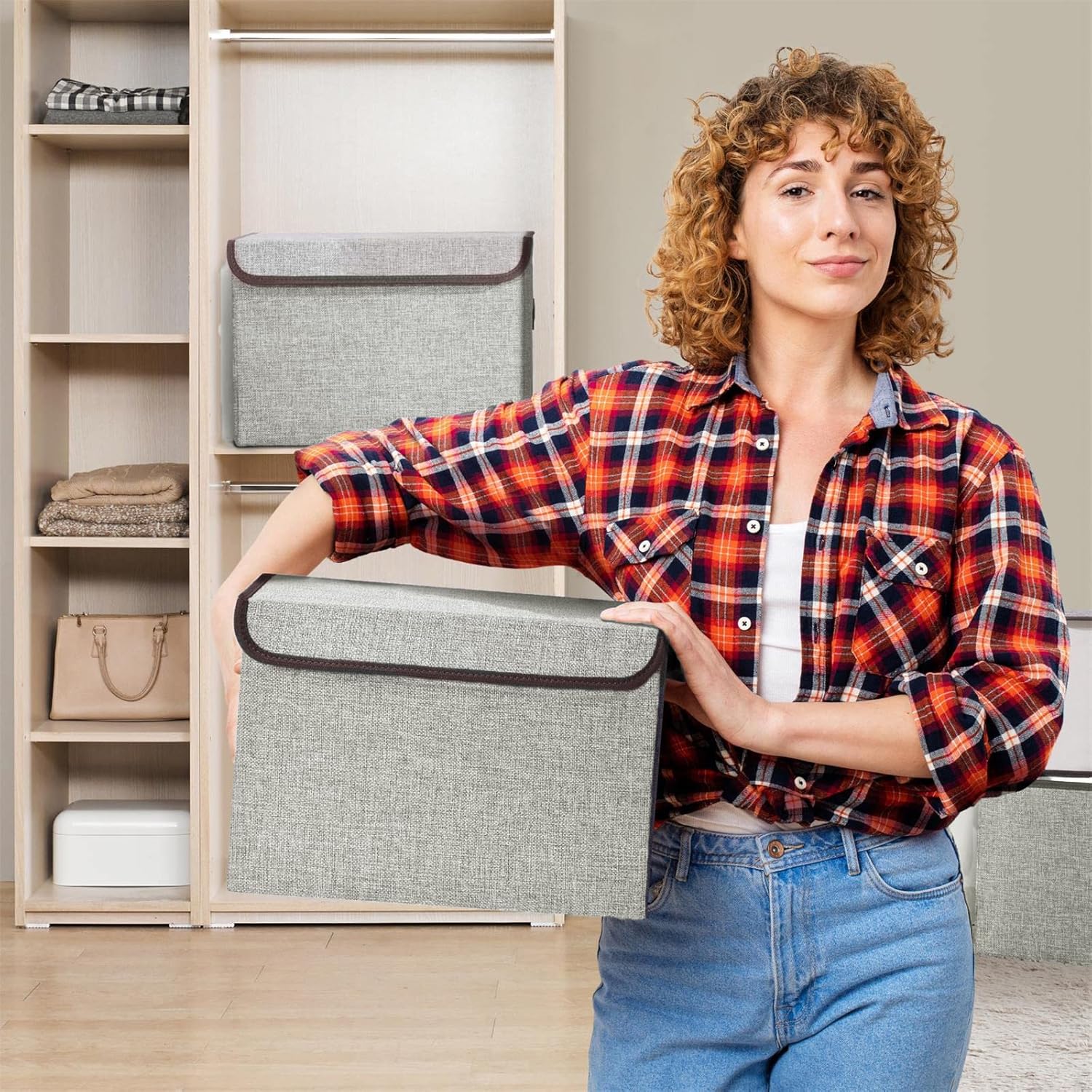- 【Large Storage Box with Lids】 - The size of this light gray storage boxes is 14.6 " (L) x 9.5" (W) x 9.5" (H). Just one cloth storage box (21L) can contain 1 blanket or 4 clothes or 8 T-shirts or 6 towels. Package contains: 4 x storage boxes.The clothes storage bins with Flip-top lid and strong velcro are easy to clean, dusting the basket with a soft dry cloth is recommended.