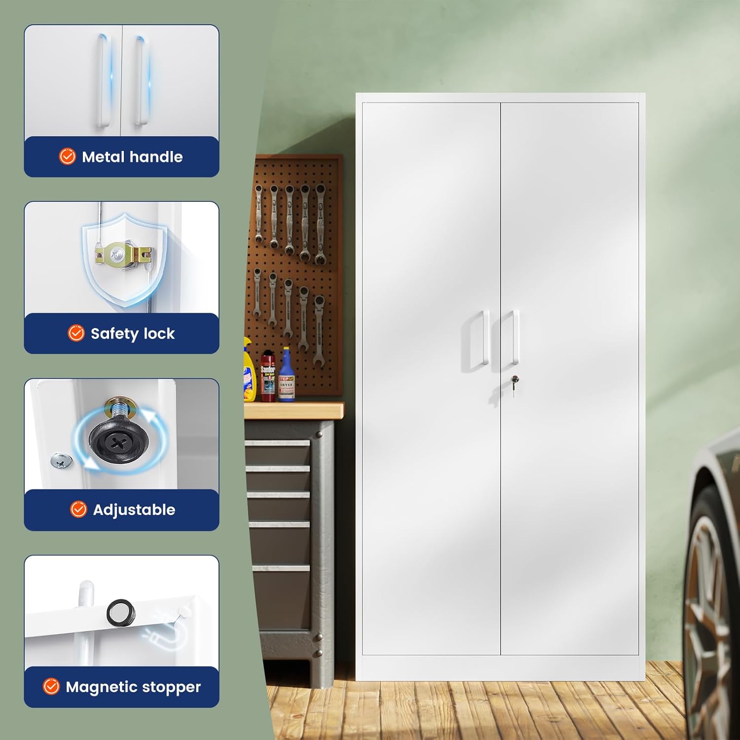 Yizosh Metal Garage Storage Cabinet with 2 Doors and 5 Adjustable Shelves - 71" Steel Lockable File Cabinet,Locking Tool Cabinets for Office,Home,Garage,Gym,School (White)