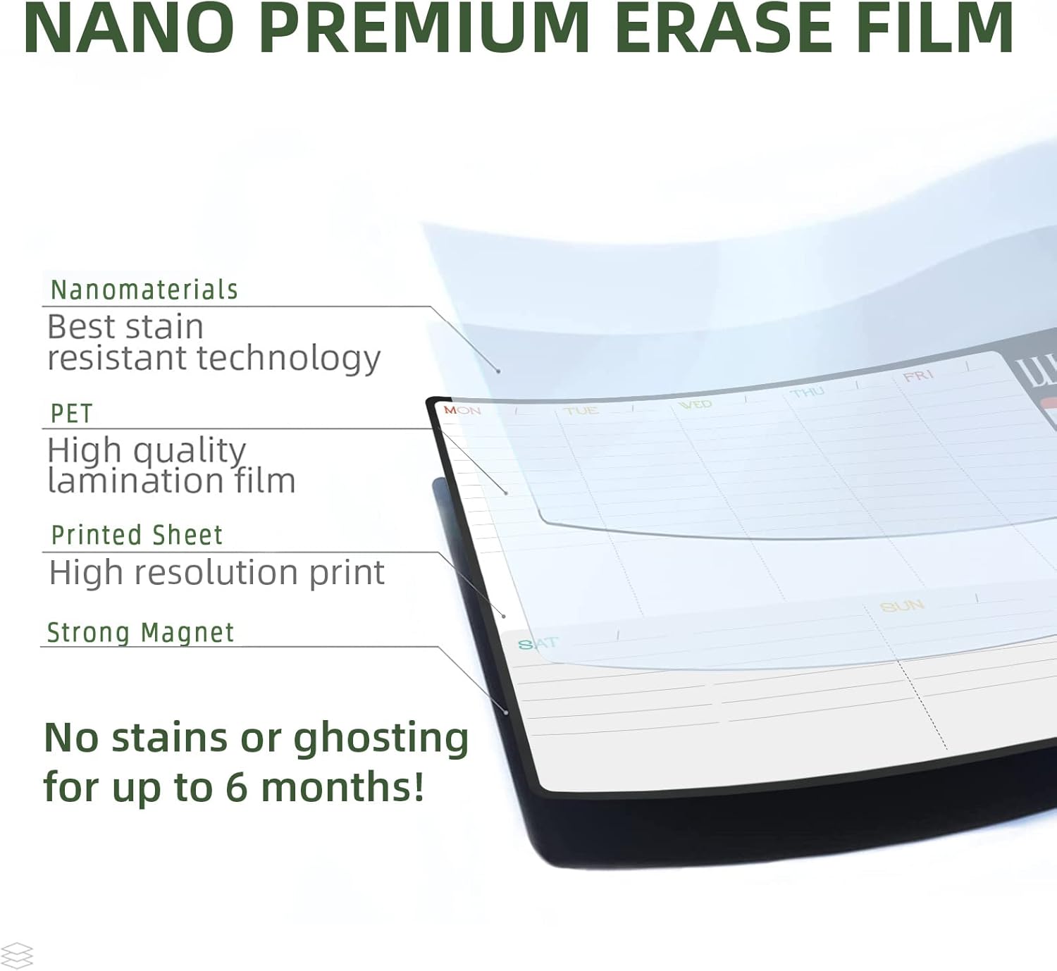 - Erases easily - We use nano premium erase film on our products. Compared to the old PET film, the nano material will make your writings super easy to be wiped off even after you leave the writings on the calendar for a long time.