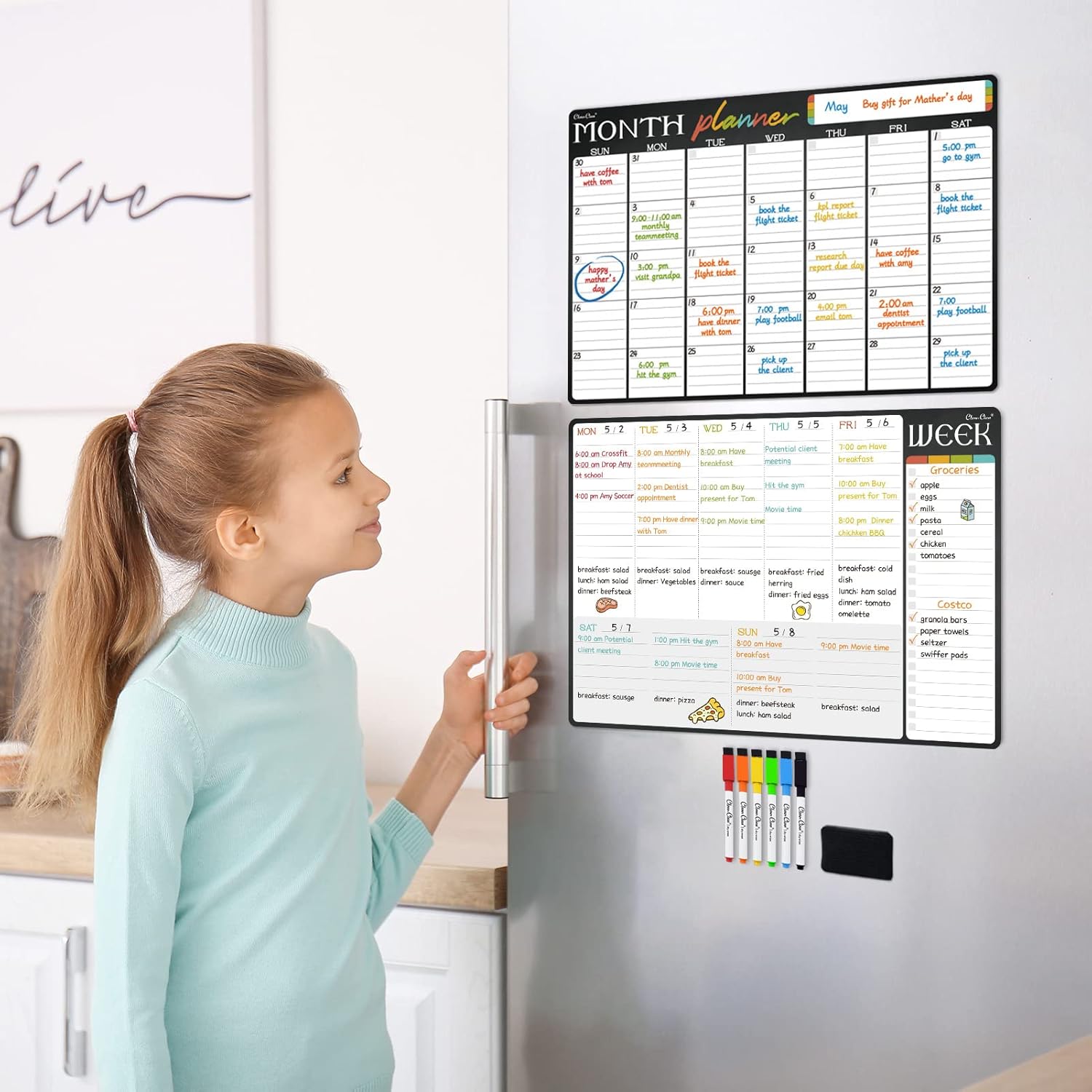 - Fine-point markers included – We also provide 6 extra-fine point markers with different colors, so you may use your own color coding. All the markers are magnetic, so you can just hang them on the fridge.