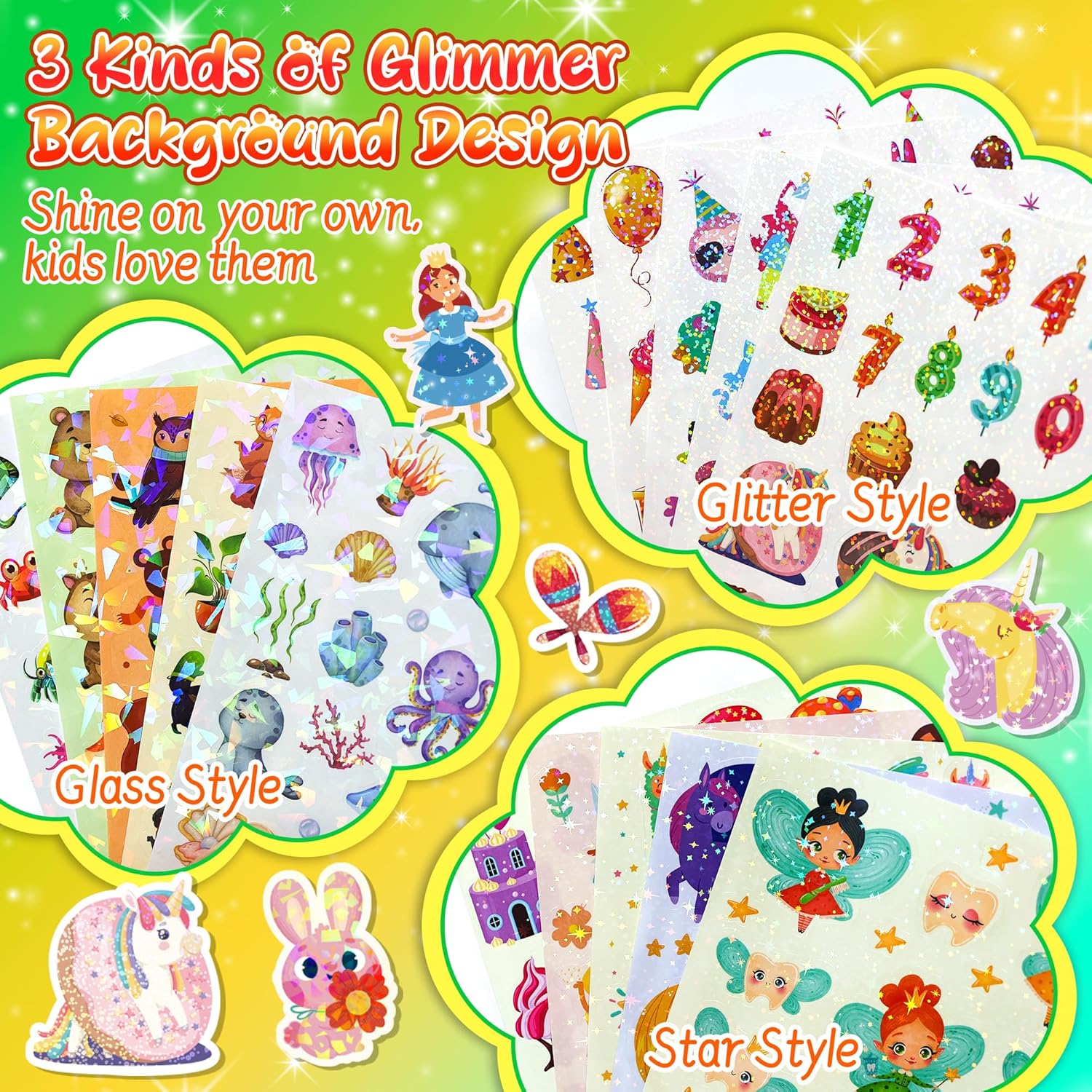 - 🍄Safe & Suitable for Kids🍄 The content of the sparkly stickers set for kids was be rigorously selected. All sticker pattern are suitable for kids age 3+. Any inappropriate image or words will never be found in this holographic sticker set. Perfect for teacher or parents to give out as rewards or prizes. Sticky and peel off really easily (easily enough that a two-year-old can do it without much struggle).