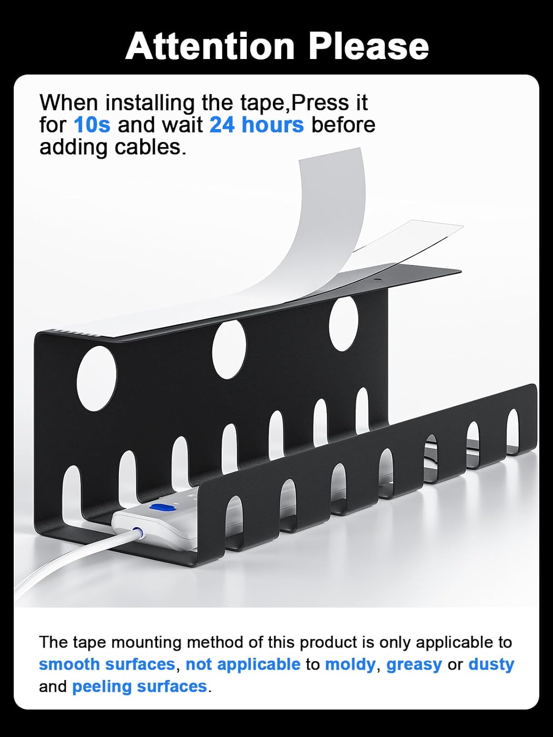 - 【Attention please】: If you choose tape mounting, please note the following three points: 1. To ensure better adhesion of the cable management tray, please make sure to clean the surface before use, the tape should only be applied to clean, dust-free, smooth and flat surfaces; the desk cord organizer is not suitable for dirty, mildewed or peeling surfaces. When installing the cable management under desk with the tape, press firmly for 10 seconds; 2. After installing the under desk cable management, wait 24 hours for the tape to fully cure before placing cables; 3. Make sure the tape is flat and free of wrinkles, which may cause the cord organizer for desk to fall off