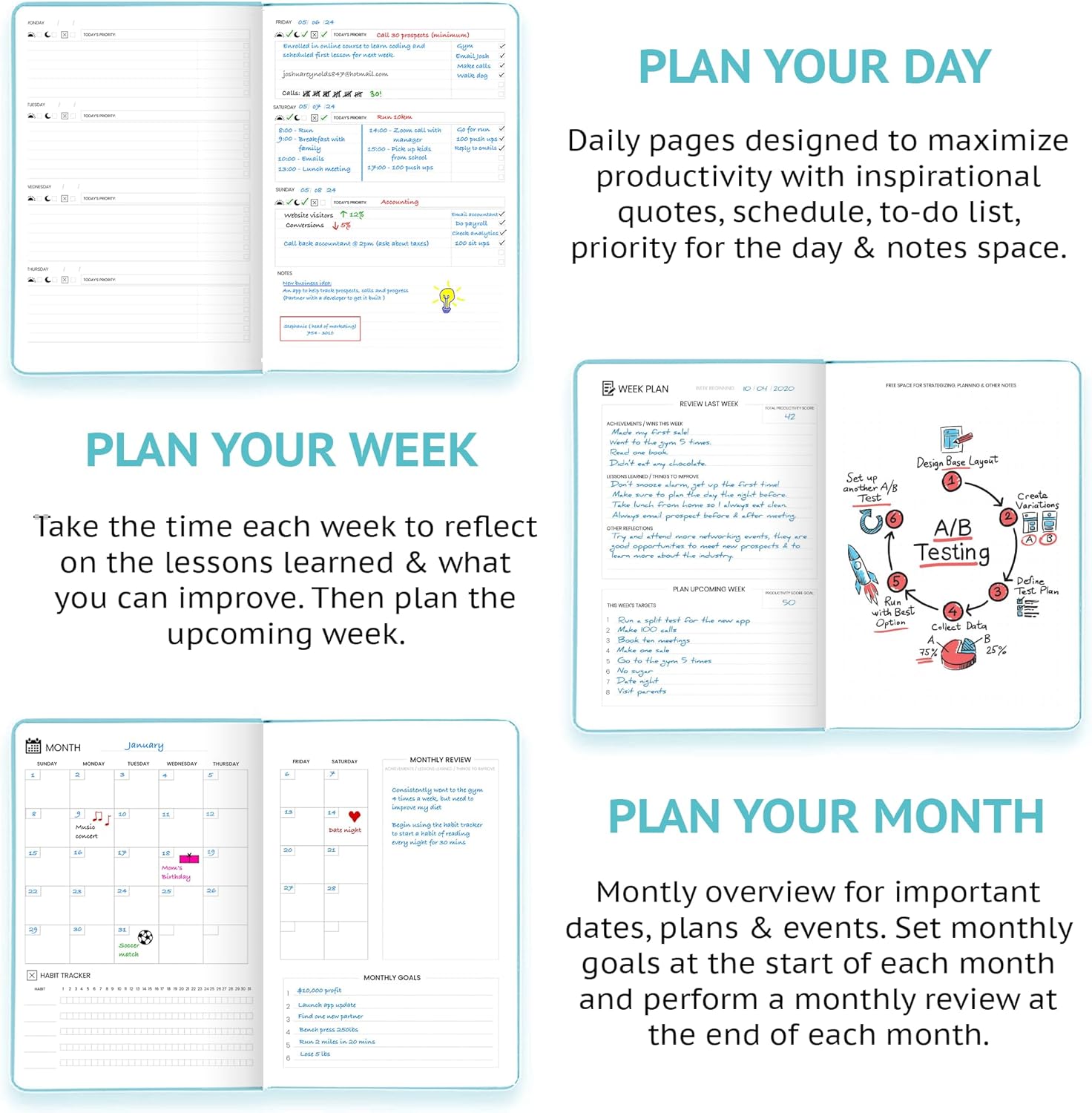 - START ANYTIME & STAY CONSISTENT – With 52 weeks of undated daily planning pages, plus weekly and monthly review sections. You can begin anytime, improve your time management and build a consistent planning habit on your own terms.