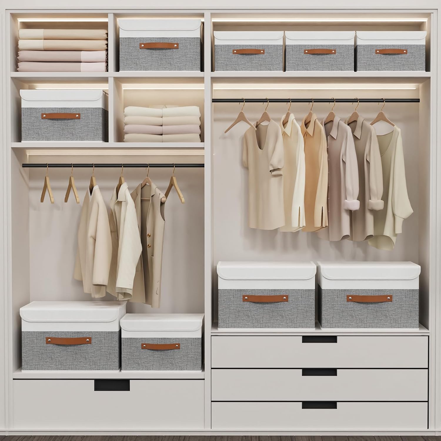 Yawinhe Collapsible Storage Bin, Cube Organizer Basket, Fabric Box with Lids, Washable and Leather Handle, for Home, Closet, White/Grey, 13.0''Lx9.0''Wx7.9''H, 3-Pack, SNK024WGS-3